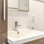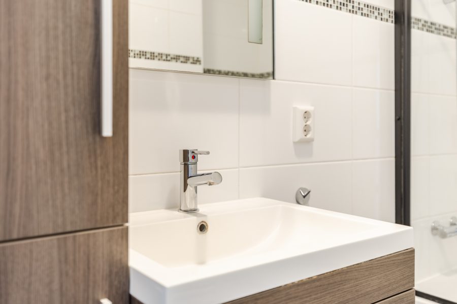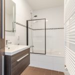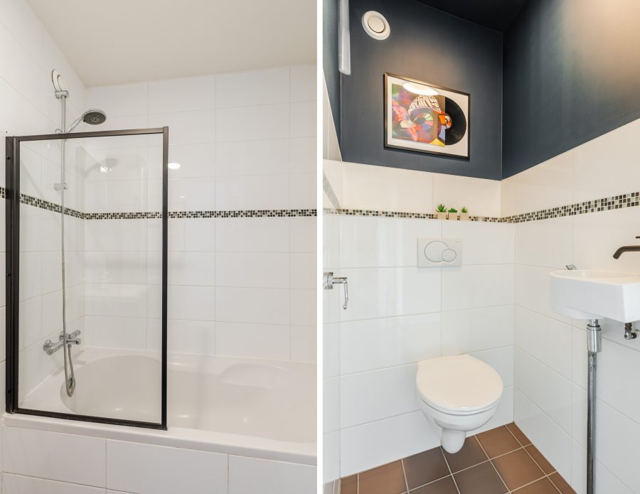 De badkamer is in 2011 vernieuwd en afgewerkt met donkere vloertegels en witte wandtegels. Deze ruimte is uitgerust met een badmeubel met wastafel, wandkast, designradiator en ligbad. Naast de badkamer bevindt zich een separaat toilet, afgewerkt in dezelfde stijl.