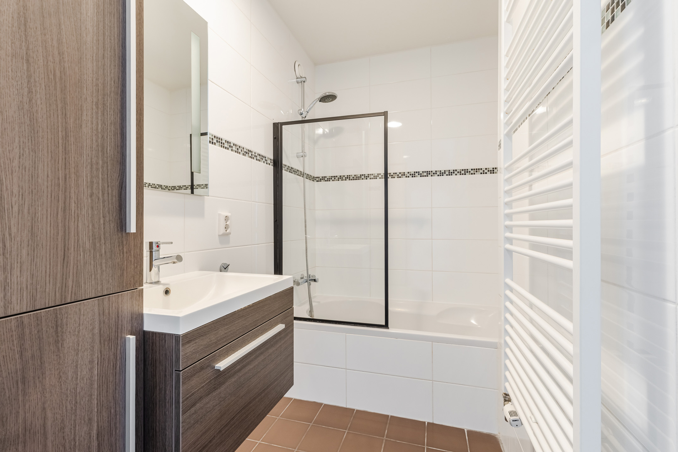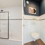 The bathroom was renovated in 2011 and finished with dark floor tiles and white wall tiles. This room is equipped with a vanity unit with sink, wall cabinet, designer radiator and bathtub. Next to the bathroom is a separate toilet, finished in the same style.