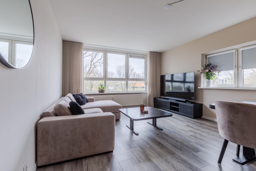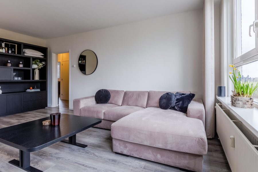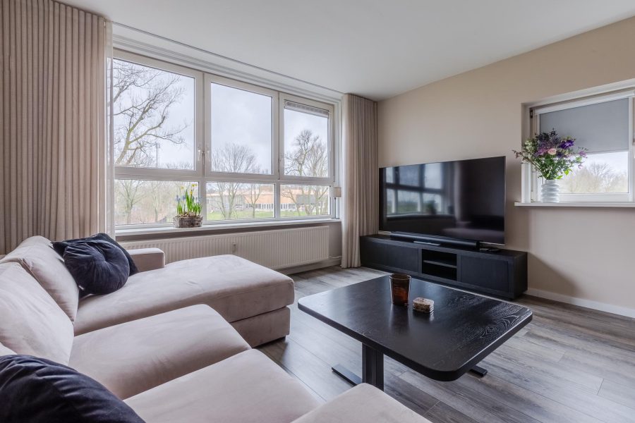 De lichte, ruime woonkamer biedt plaats genoeg voor een zithoek en een eettafel. Het daglicht komt binnen via een breed raam aan de voorzijde en een zijraam (hoekligging). In de woning ligt laminaat en de muren en plafonds zijn strak afgewerkt.