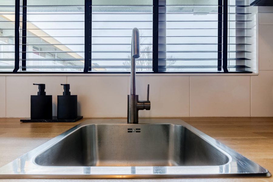 Met de lift of via de trap bereik je de galerij op de tweede verdieping en de voordeur van de woning. Entree met meterkast en garderobe. Tochtdeur naar de hal. Aan je linkerhand bevindt zich een open toegang tot de keuken. De L-vormige keuken (2022) heeft zwarte fronten en is voorzien van diverse inbouwapparatuur. Verderop in de hal tref je het zwevende toilet met fonteintje aan, de badkamer, de slaapkamer en de open verbinding naar de woonkamer.