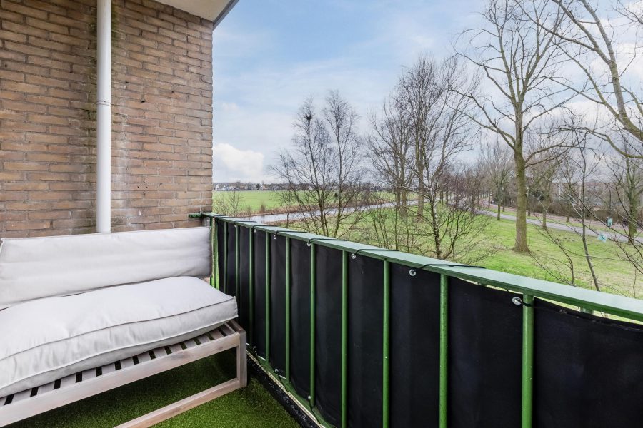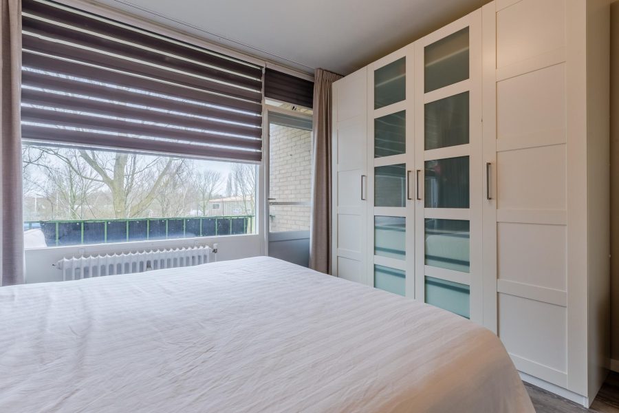 De eigentijdse badkamer is voorzien van een badmeubel met waskom en spiegel, een kast met de aansluiting voor het witgoed en een inloopdouche met hand- en regendouche. De slaapkamer ligt aan de achterzijde van de woning, naast de woonkamer. In de slaapkamer is plaats genoeg voor een tweepersoonsbed en een ruime kledingkast. De slaapkamer heeft toegang tot een balkon, waar je een fijne loungeplek kunt realiseren en kunt genieten van het uitzicht over een groene omgeving.