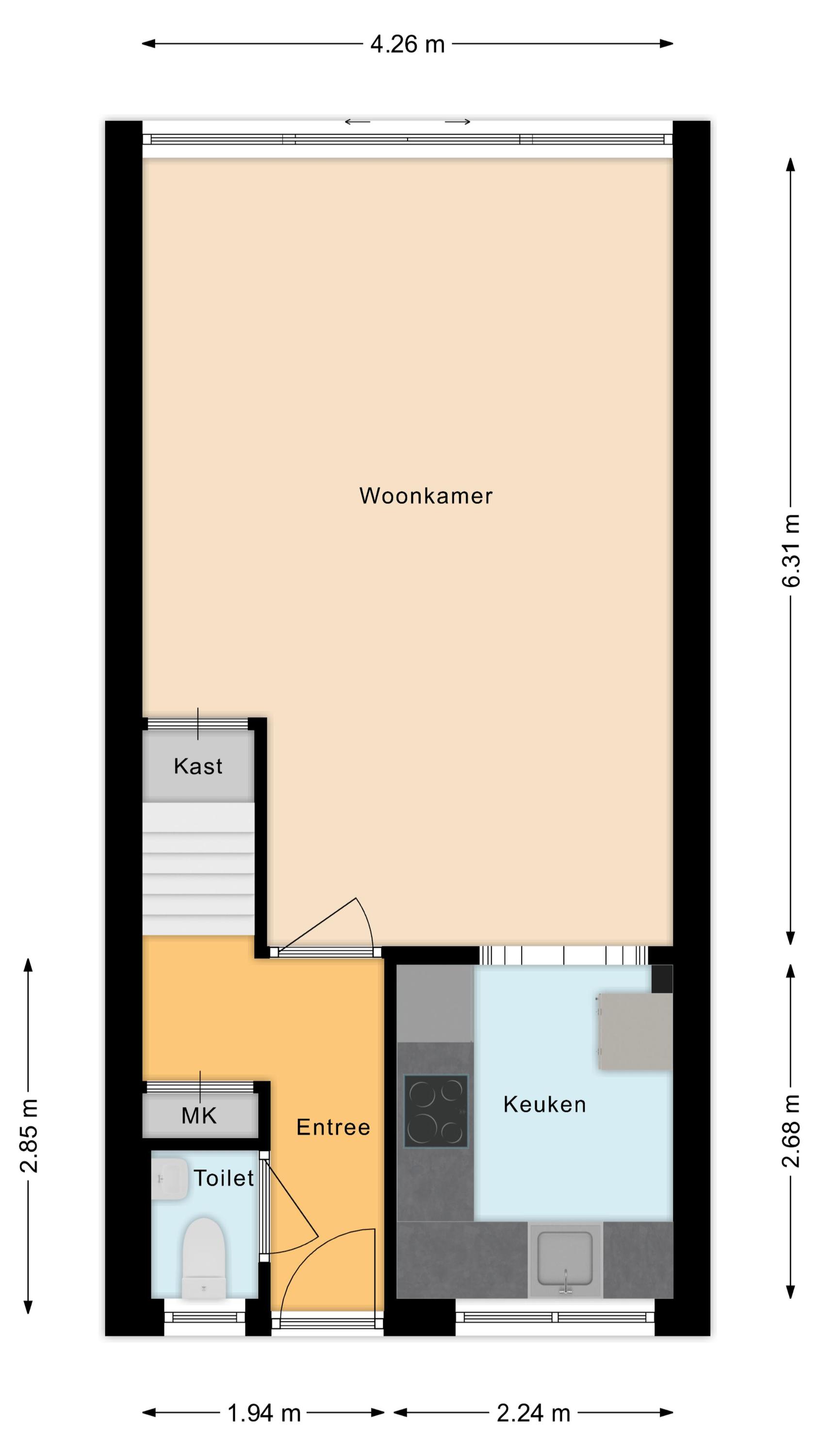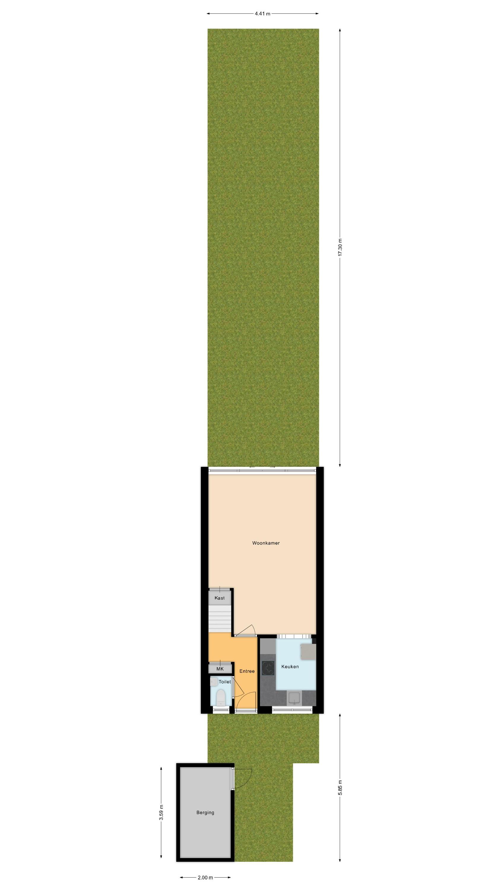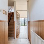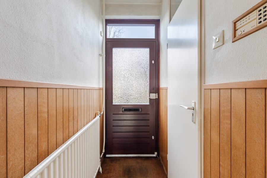 Via de betegelde voortuin met fietsenberging bereik je de voordeur van deze woning. Achter de voordeur bevindt zich de entreehal met toegang tot een toiletruimte met staand toilet en fonteintje, de meterkast, de trap naar de eerste verdieping en de woonkamer.