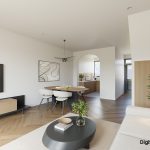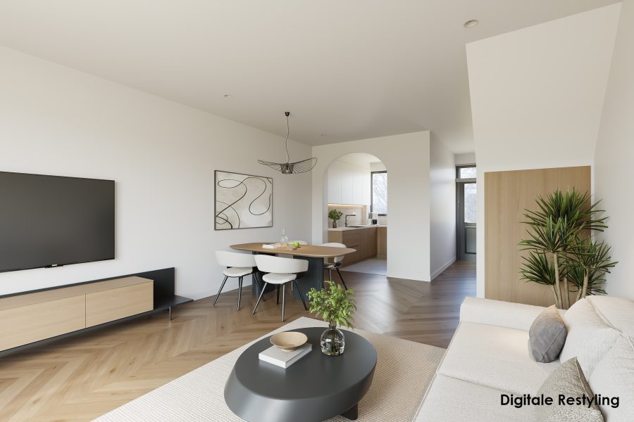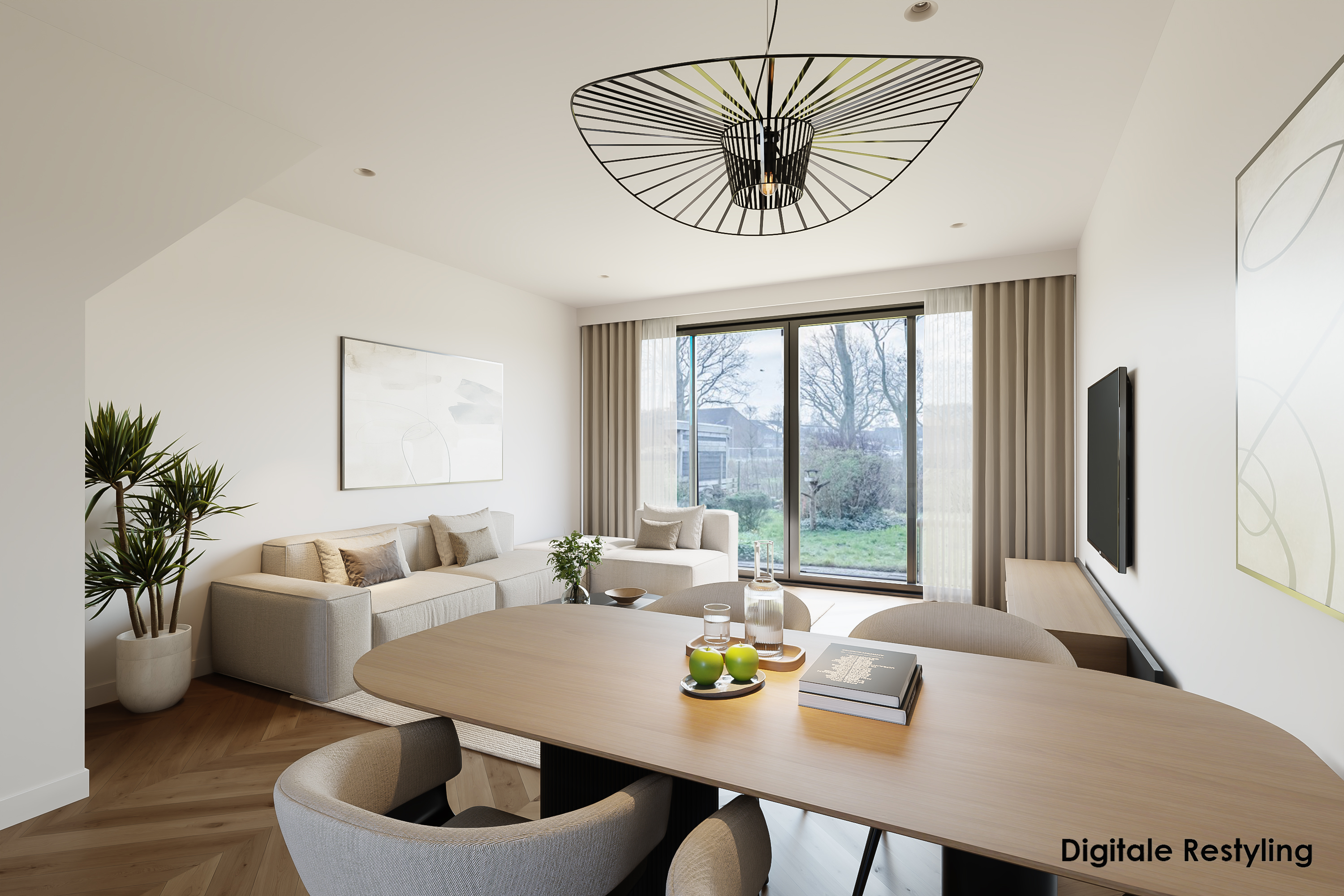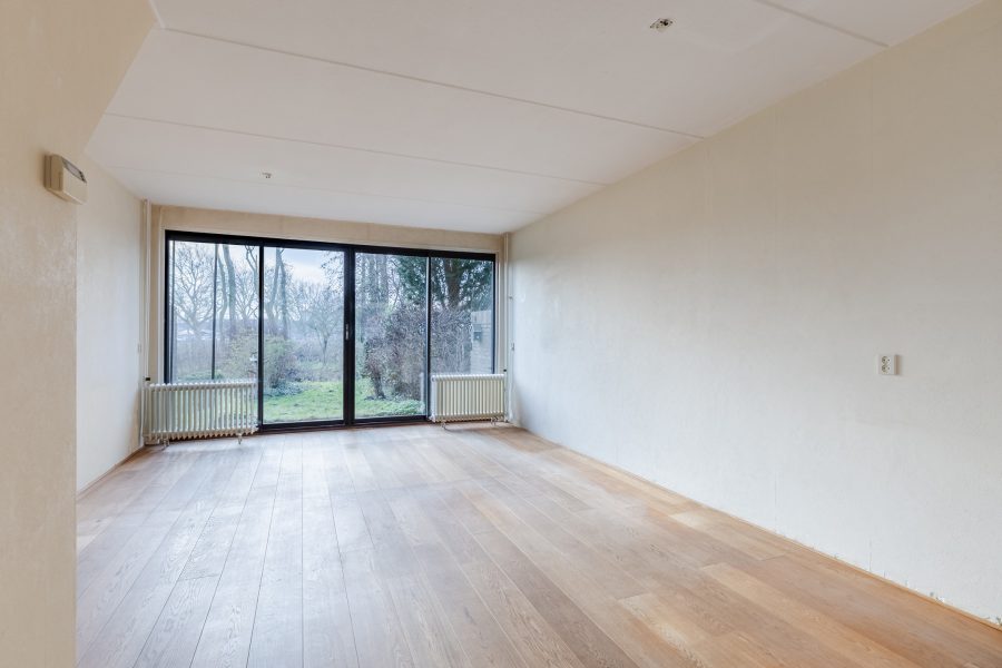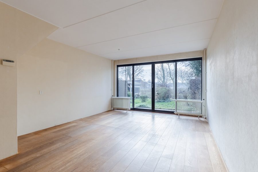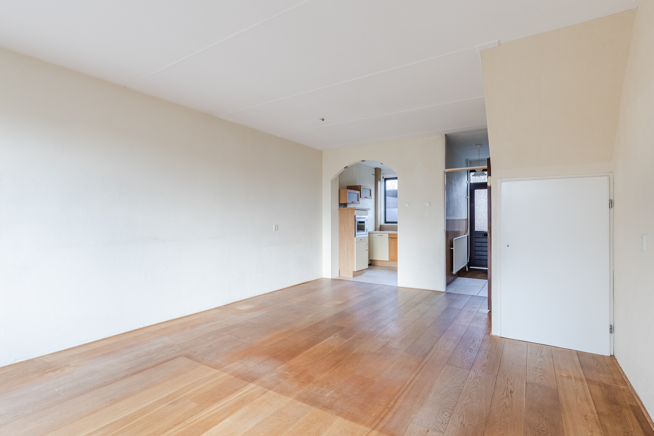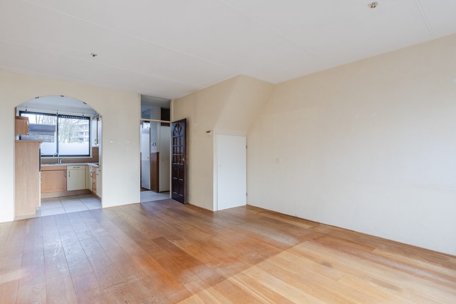 De ruime woonkamer is voorzien van een parketvloer. Dankzij de grote schuifpui aan de achterzijde en het grote raam aan de voorzijde valt er veel natuurlijk licht binnen. De woonkamer biedt toegang tot een trapkast om spullen op te bergen. De woonkamer en keuken zijn met elkaar verbonden via een toog. In de keukenruimte ligt een tegelvloer.