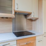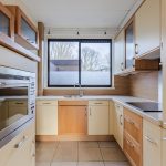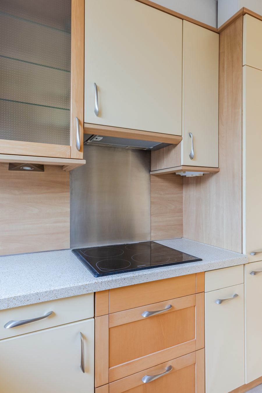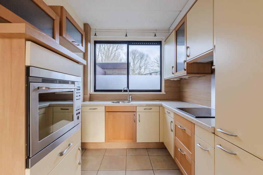 De keuken (2002) heeft een mooi design met houtkleurige en zachtgele keukenkastjes en een gespikkeld werkblad. Hier tref je de volgende apparatuur aan: kookplaat (2004), afzuigkap, oven en koel-vriescombinatie (2015).
