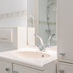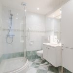 The spacious bathroom is finished with green and cream-colored tiles. This room is equipped with a floating toilet, vanity unit with sink, wall cabinet and shower cabin. The bathroom is lit with recessed spotlights.
