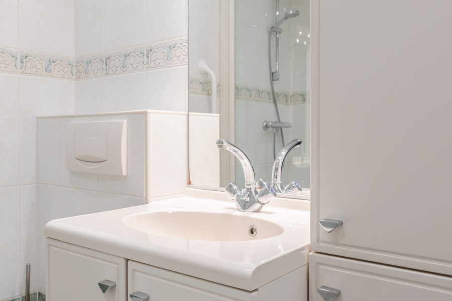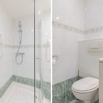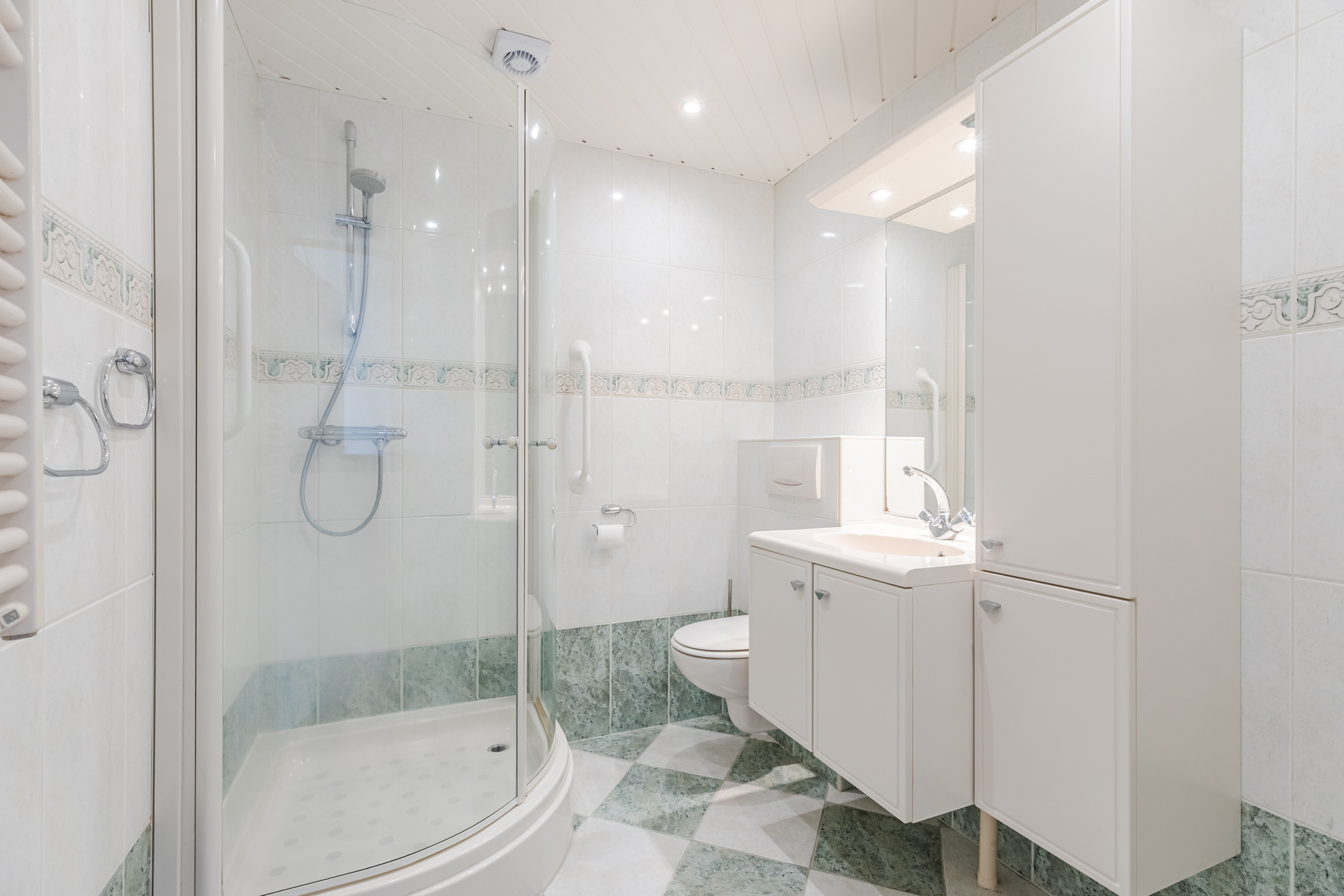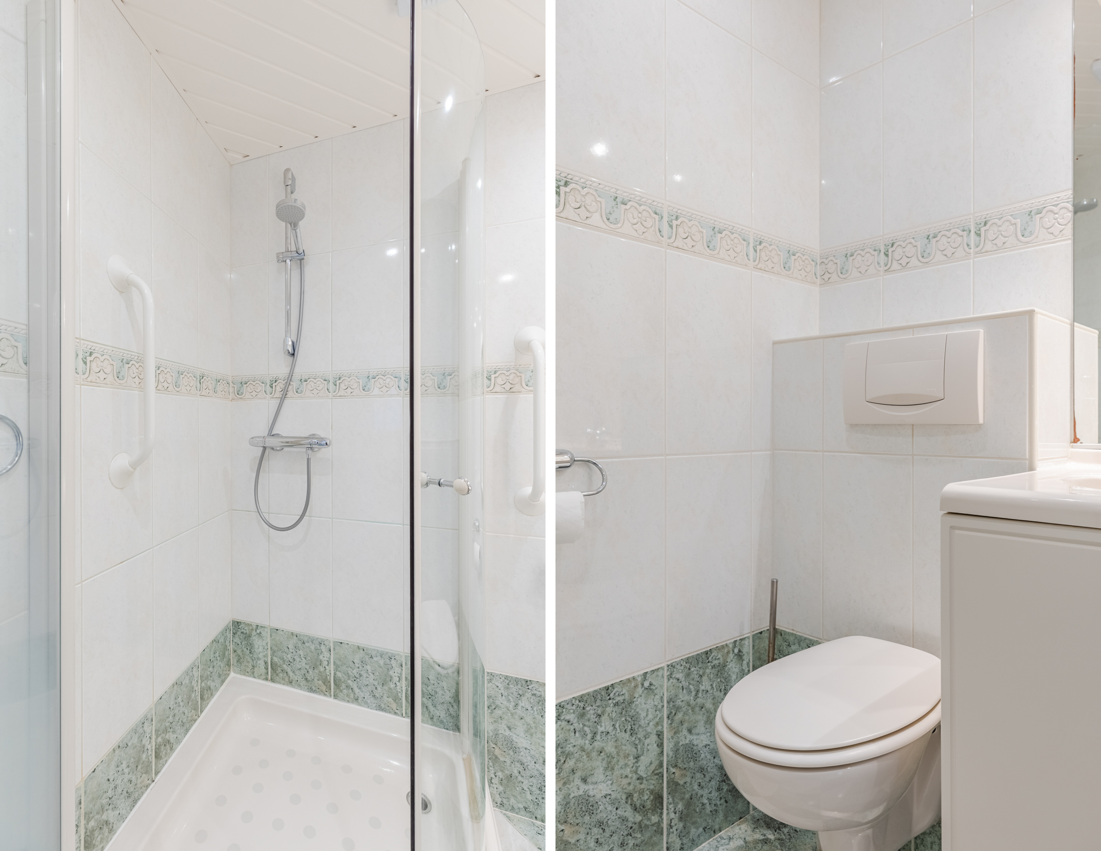 De ruime badkamer is afgewerkt met groene en crèmekleurige tegels. Deze ruimte is uitgerust met een zwevend toilet, badmeubel met wastafel, wandkast en douchecabine. De badkamer wordt verlicht met inbouwspots.