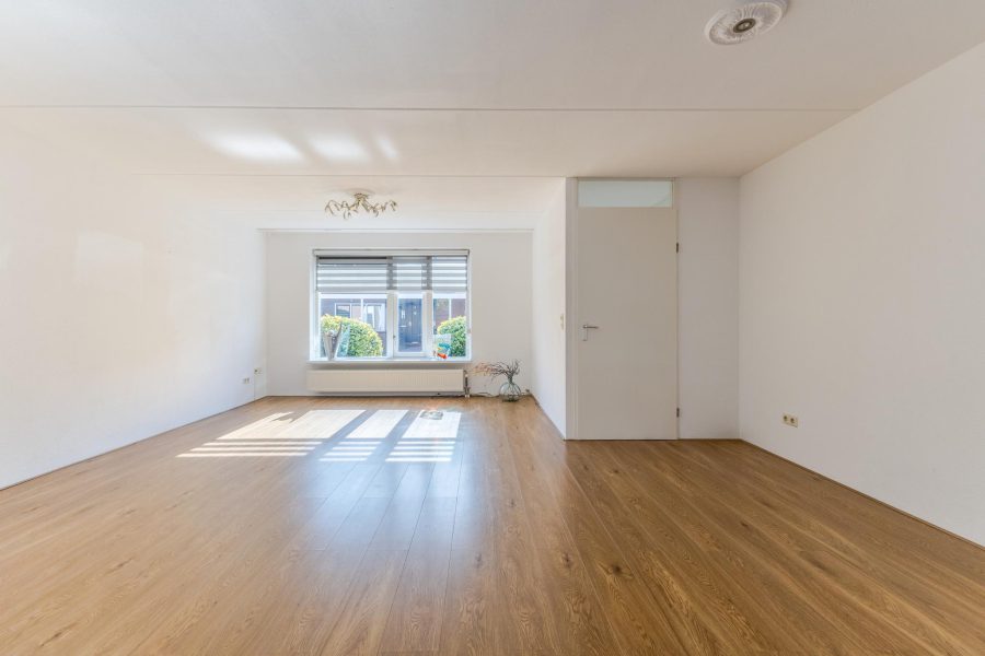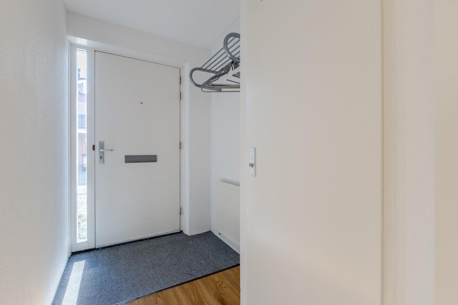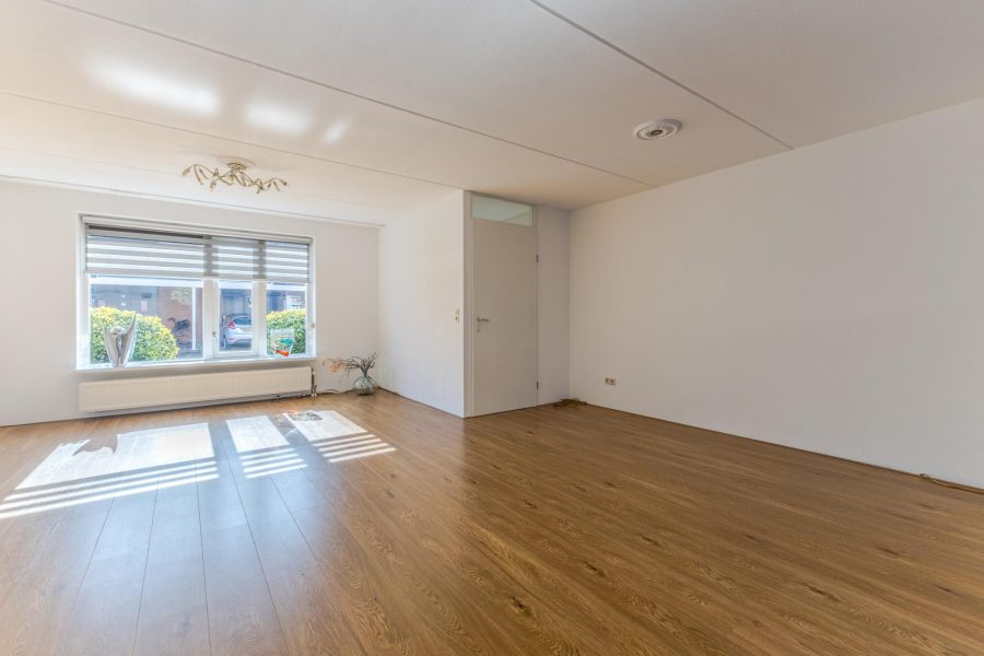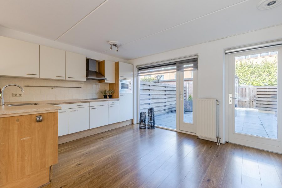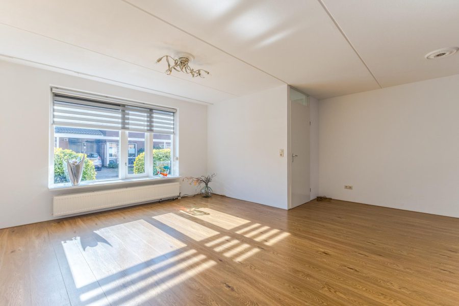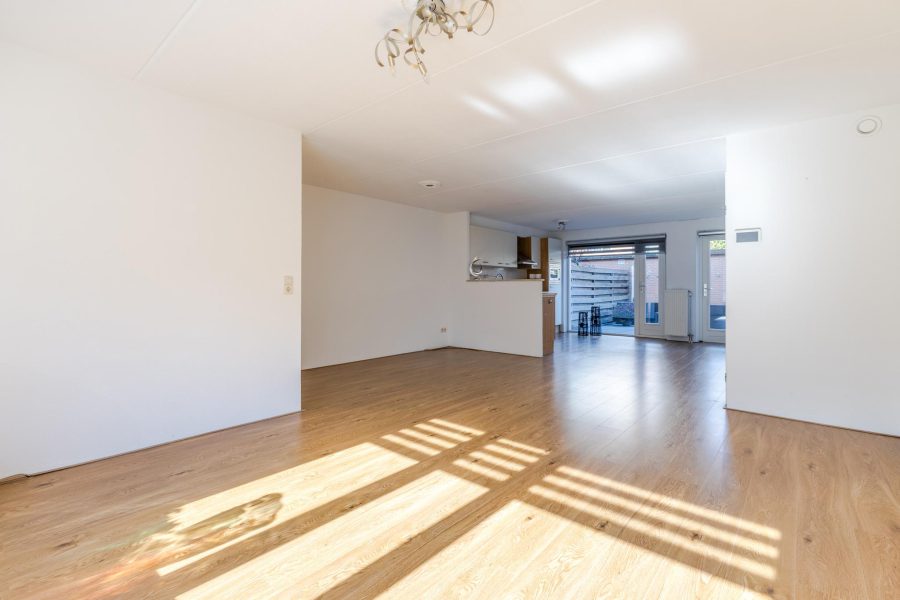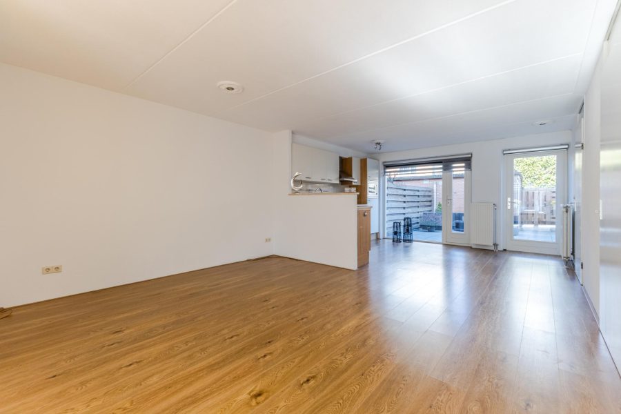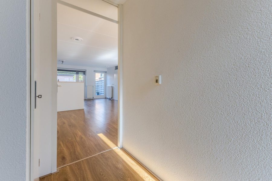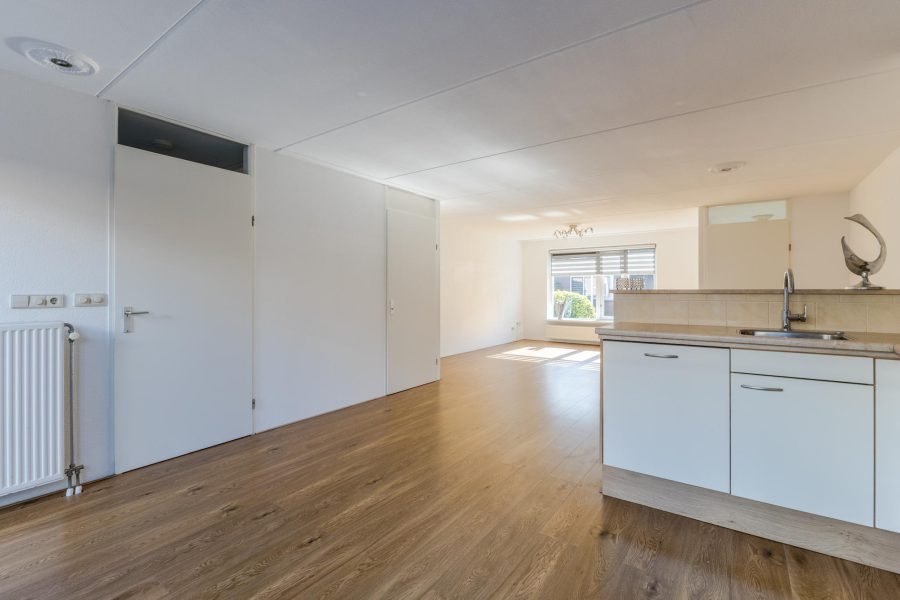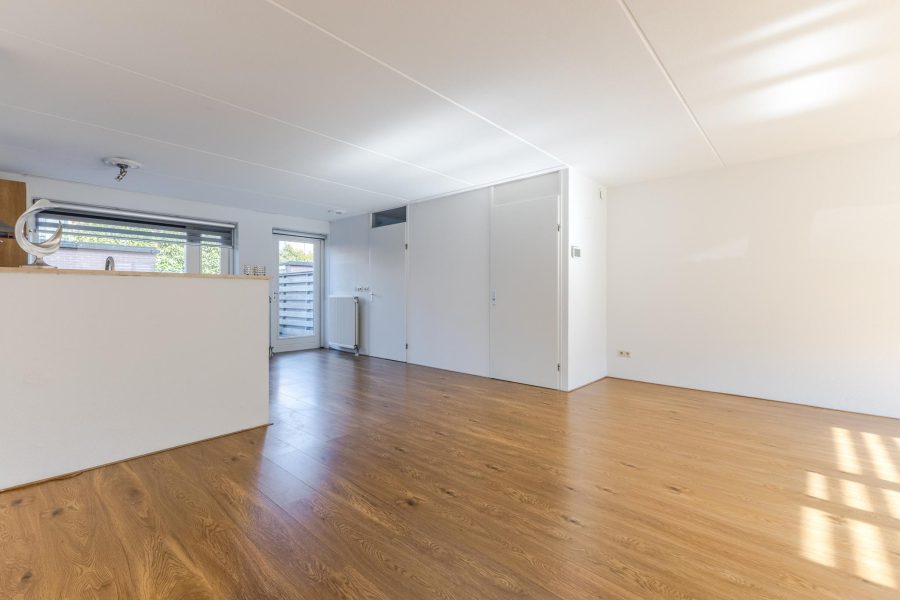 Via de deels groene, deels betegelde voortuin bereiken we de overkapte voordeur. Entree met meterkast en garderobe en toegang tot de woonkamer met open keuken. Aan de voorzijde heeft de woonkamer een raampartij, hier is plaats voor een ruime zithoek, aan de achterzijde is de L-vormig keuken gesitueerd. De keuken heeft witte fronten en is voorzien van diverse inbouwapparatuur (vaatwasser uit 2020). Je kookt hier elektrisch. Aan de achterzijde tref je een brede hoge raampartij aan en twee toegangsdeuren tot de tuin. In de woonkamer bevindt zich een voorraadkast.