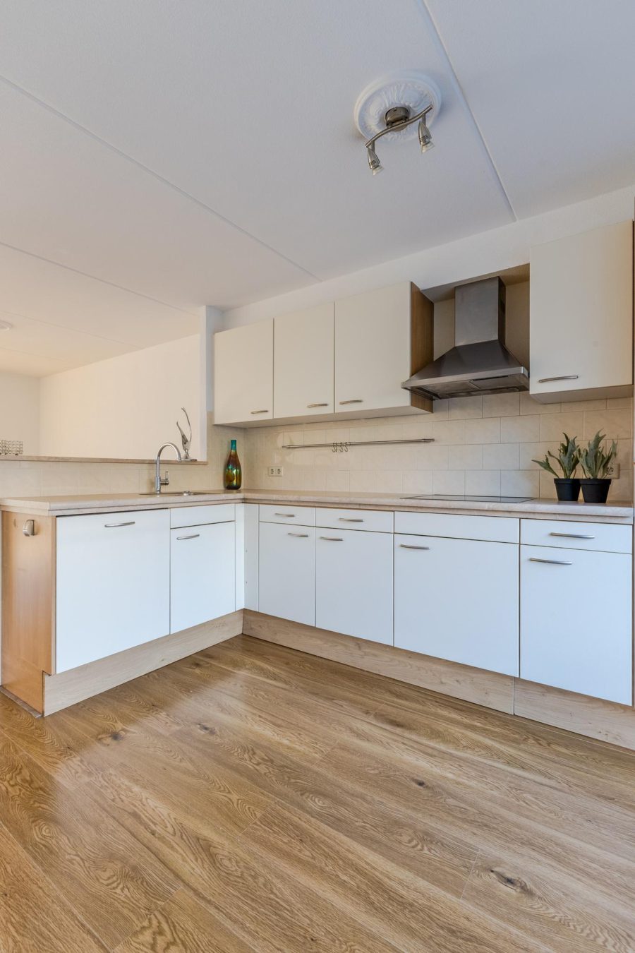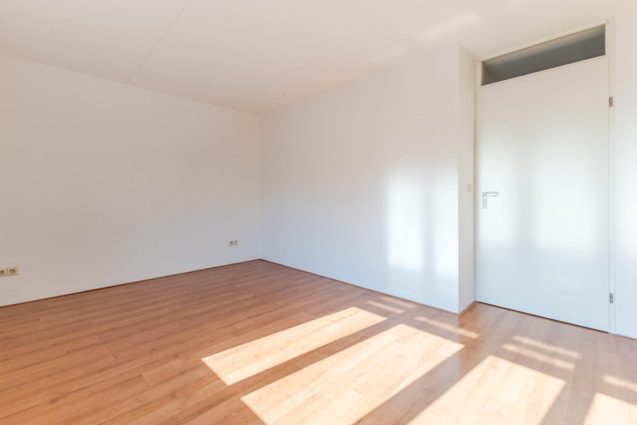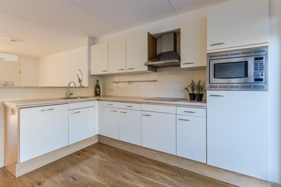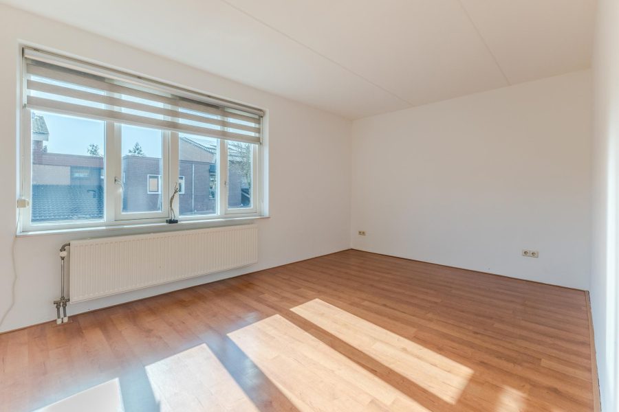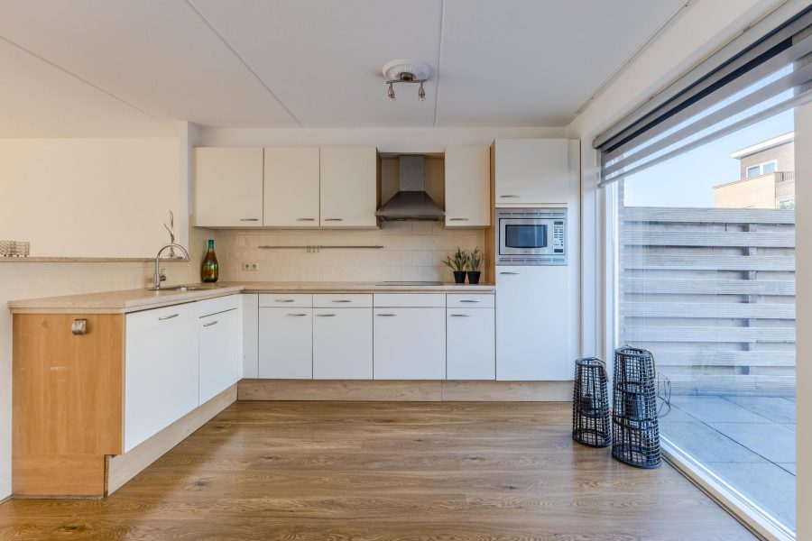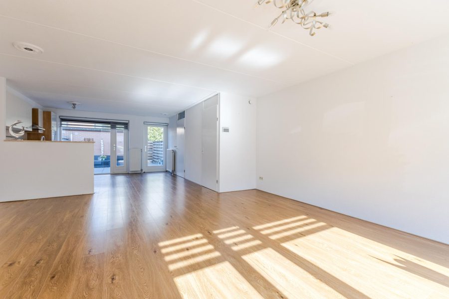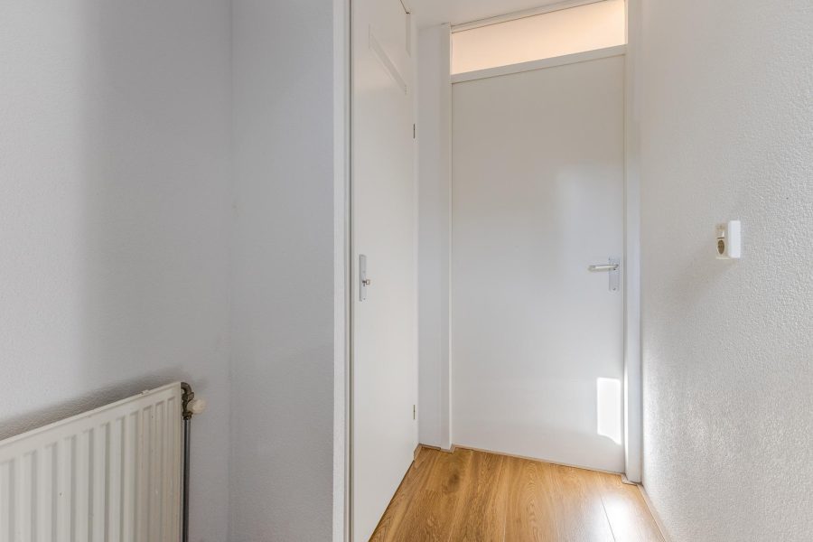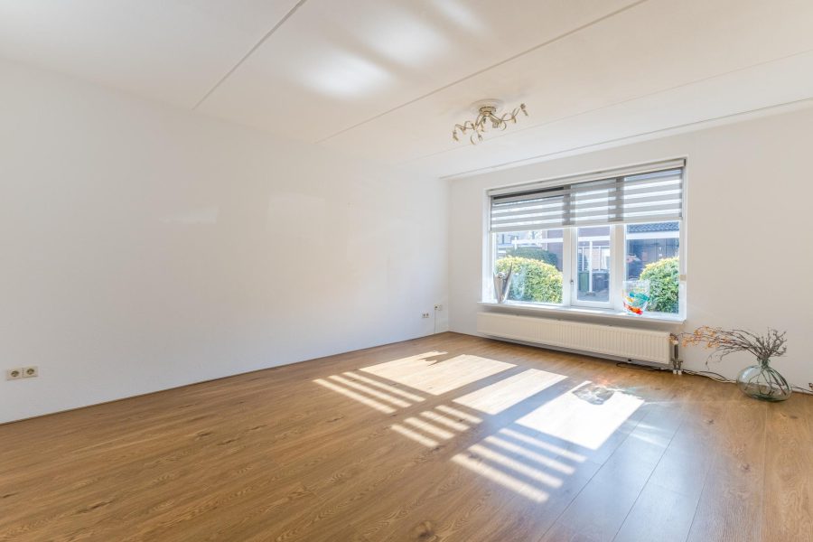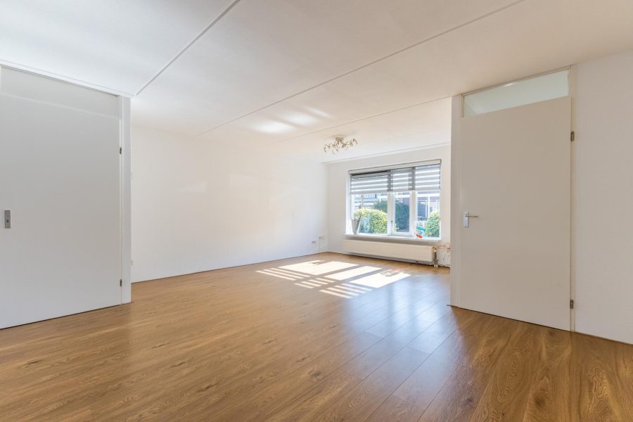 Via de deels groene, deels betegelde voortuin bereiken we de overkapte voordeur. Entree met meterkast en garderobe en toegang tot de woonkamer met open keuken. Aan de voorzijde heeft de woonkamer een raampartij, hier is plaats voor een ruime zithoek, aan de achterzijde is de L-vormig keuken gesitueerd. De keuken heeft witte fronten en is voorzien van diverse inbouwapparatuur (vaatwasser uit 2020). Je kookt hier elektrisch. Aan de achterzijde tref je een brede hoge raampartij aan en twee toegangsdeuren tot de tuin. In de woonkamer bevindt zich een voorraadkast.