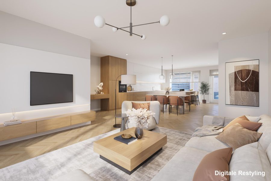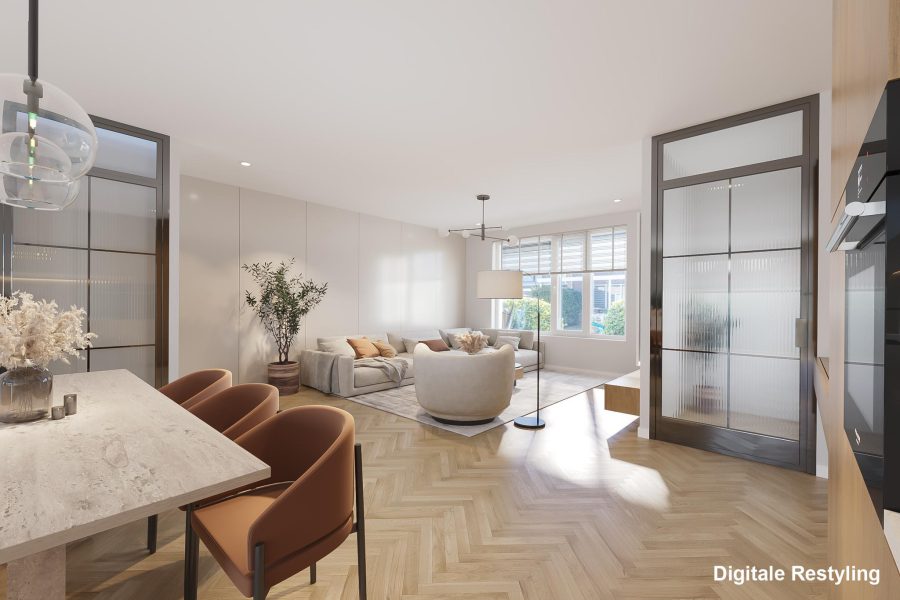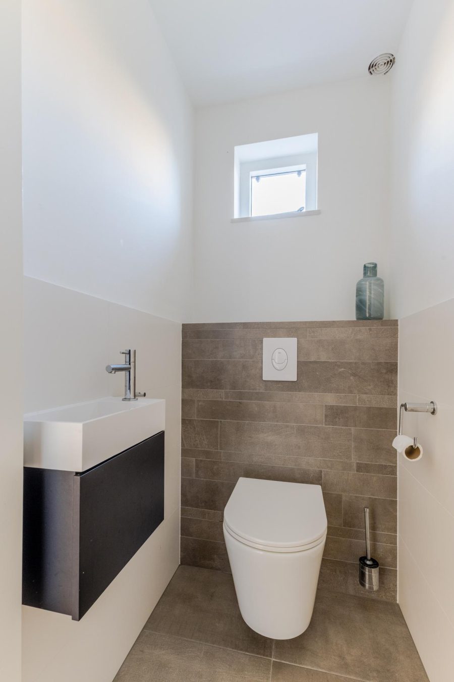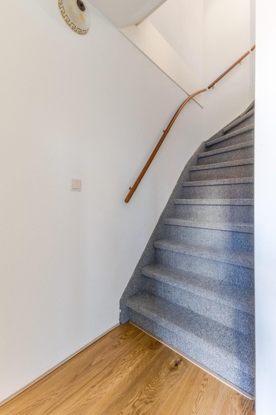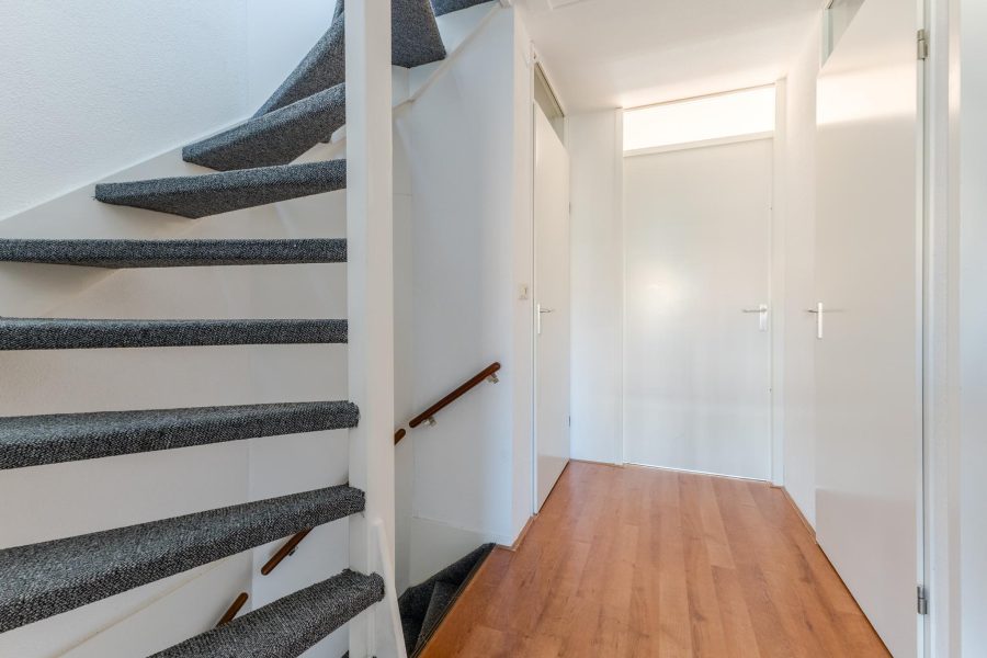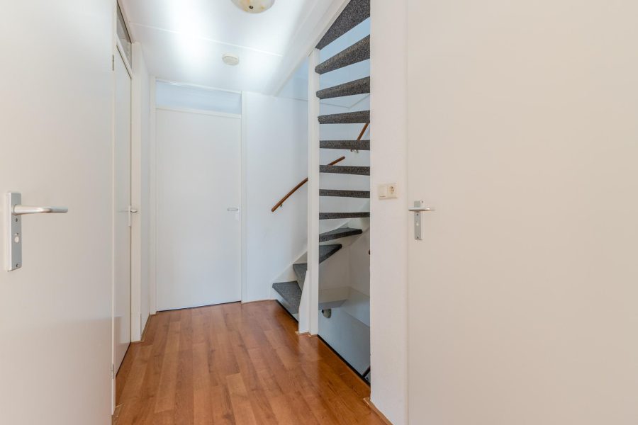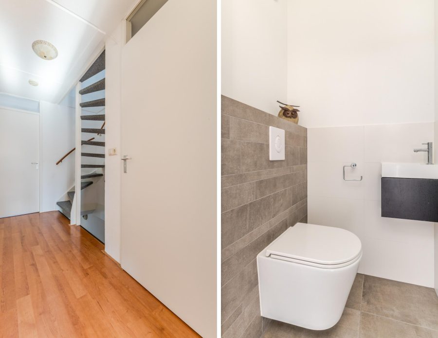Via een deur in de woonkamer bereik je een tussenhal met het zwevende toilet met fonteintje en de trapopgang naar de eerste verdieping. De muren en plafonds van de begane grond zijn strak en neutraal afgewerkt.