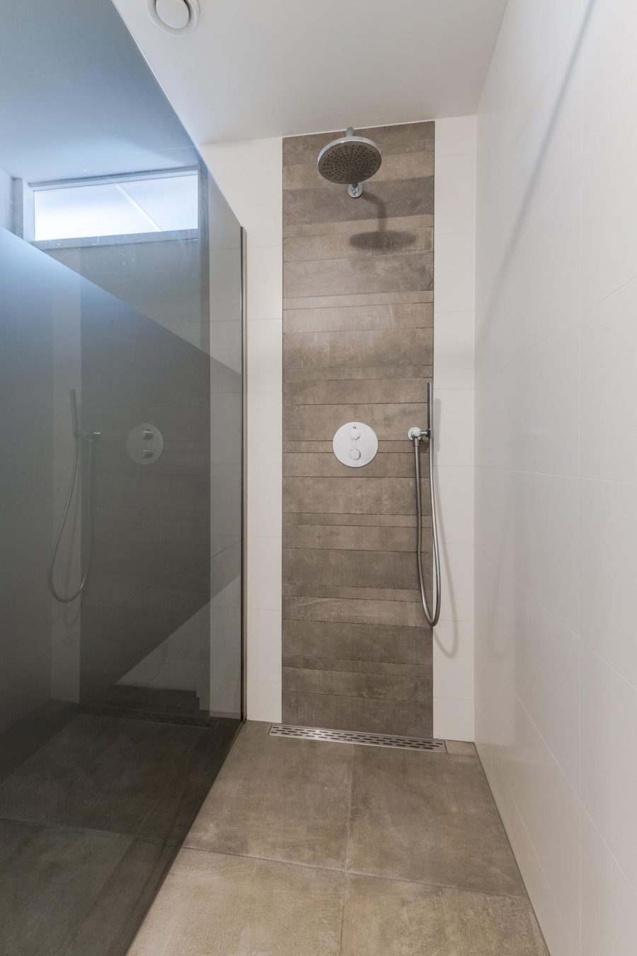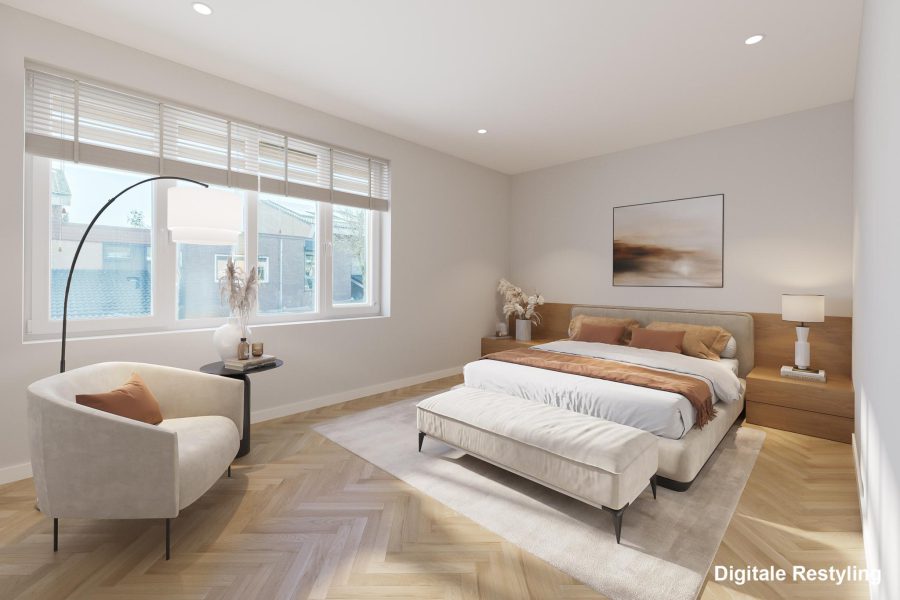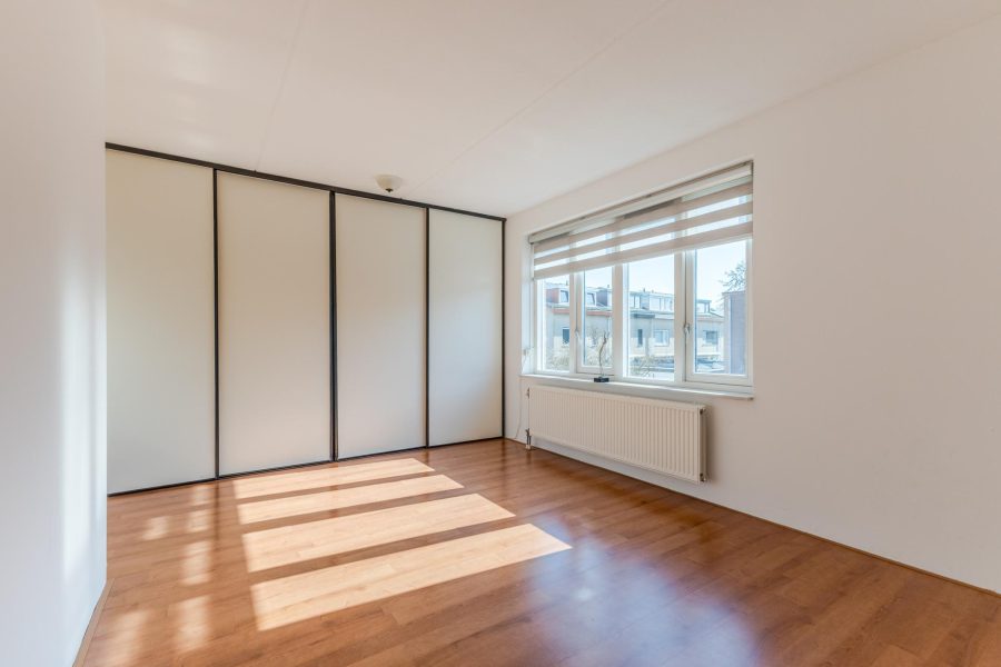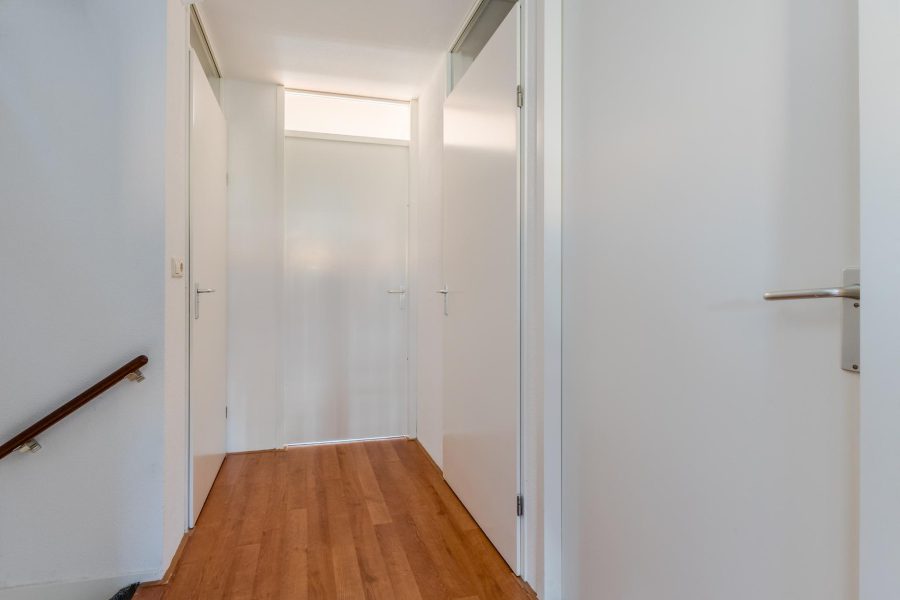 Via the upholstered staircase, we reach the landing of this floor. Here you will find three bedrooms, a separate floating toilet with hand basin and the bathroom. Two bedrooms are at the back and the master bedroom is at the front. This spacious room has a wall-to-wall wardrobe. Central on the floor is the contemporary bathroom (2022). The ceiling-tiled bathroom comprises a vanity unit with washbasin and mirror, a design radiator, a bathtub and a walk-in shower with handheld and rain shower. This floor is also excellently finished.