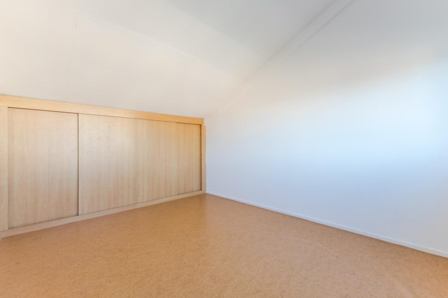 Via the upholstered open staircase, we reach the landing of this floor. Here you can find the fourth bedroom and three more enclosed storage rooms including the technical installation and the connection for washer and dryer.