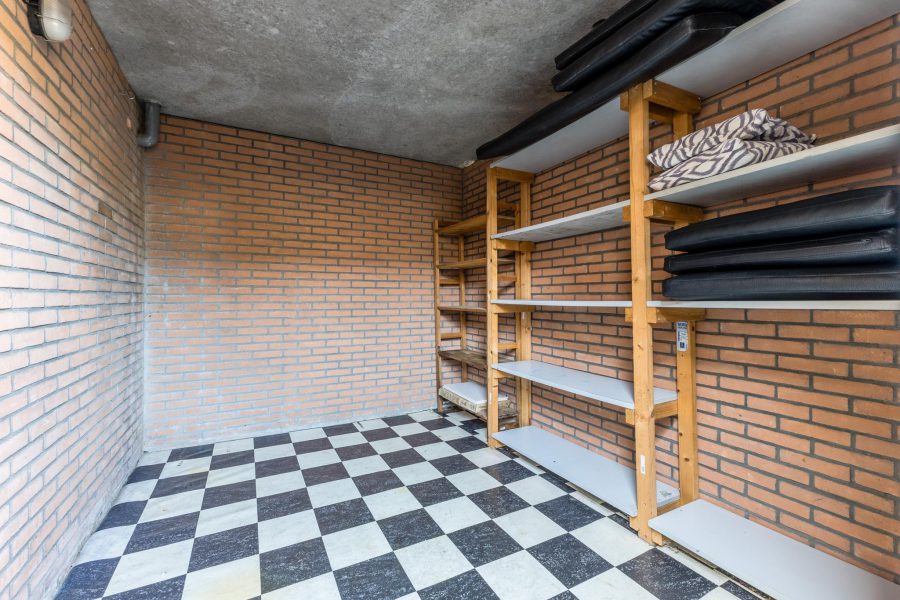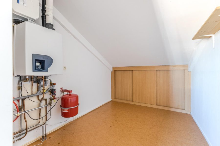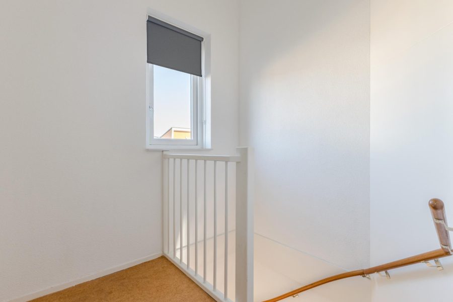 Via de gestoffeerde open trap bereiken we de overloop van deze verdieping. Hier is de vierde slaapkamer te vinden en nog drie afgesloten bergingen met o.a de technische installatie en de aansluiting voor het witgoed.