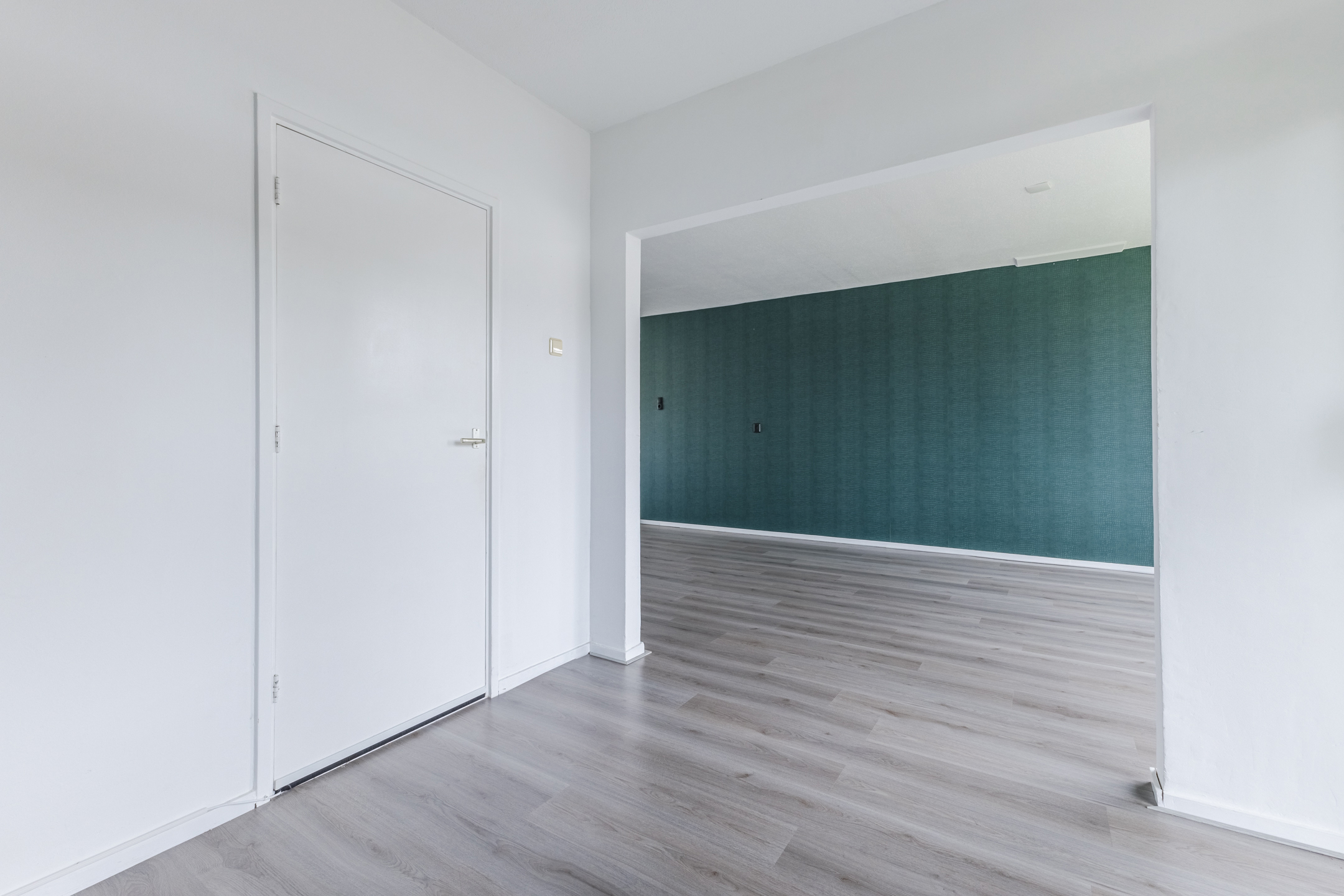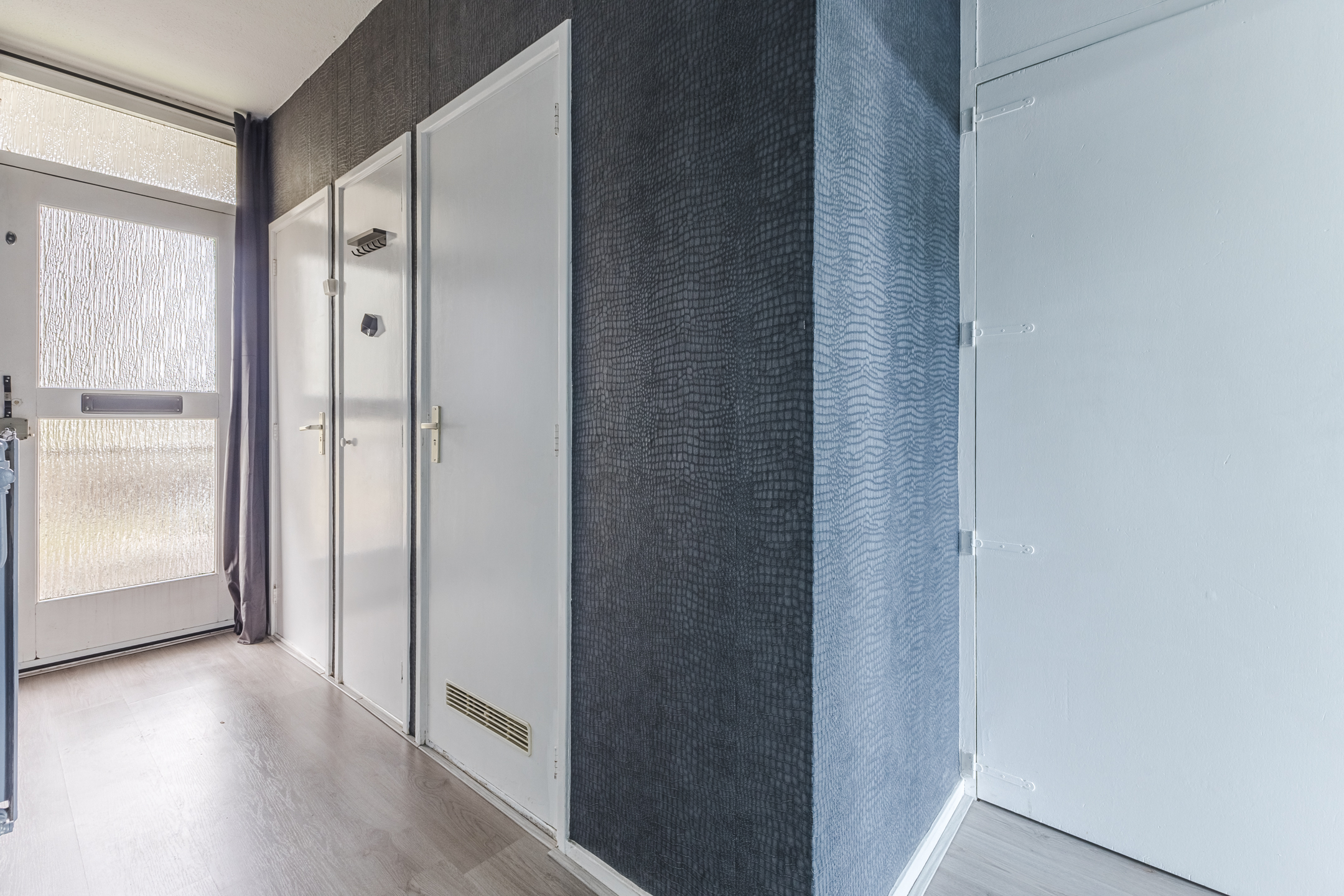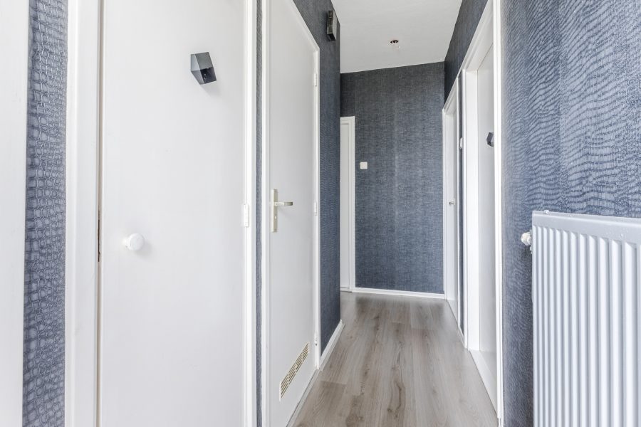 Het appartement bevindt zich op de eerste verdieping. Na binnenkomst word je verwelkomd door een ruime, netjes afgewerkte entreehal. Vanaf hier bereik je de meterkast, een bergkast en meerdere vertrekken.