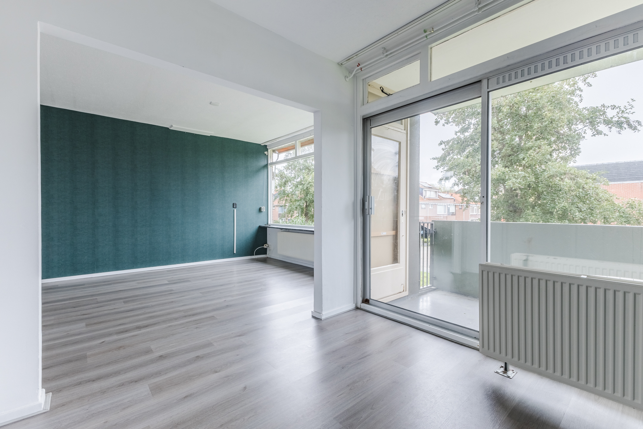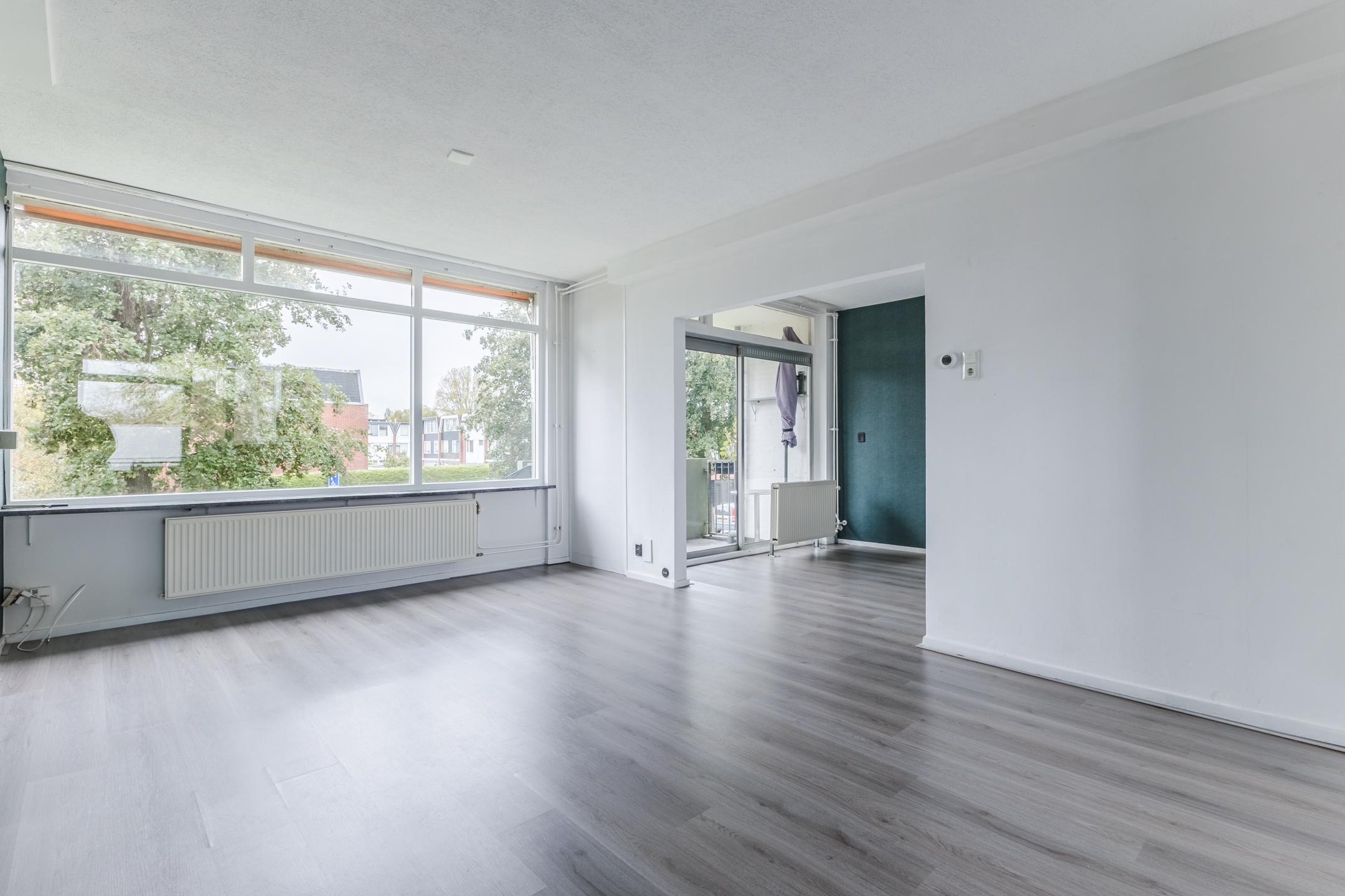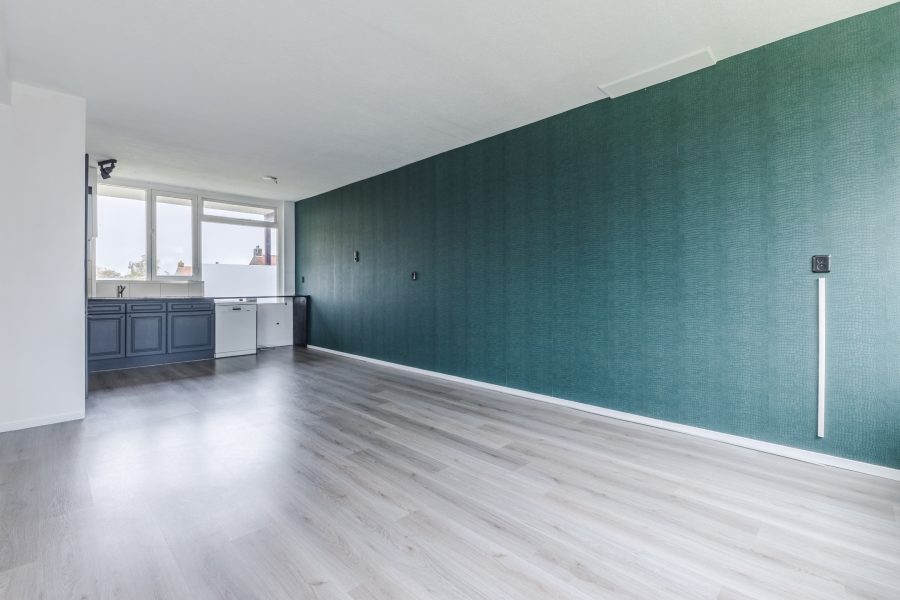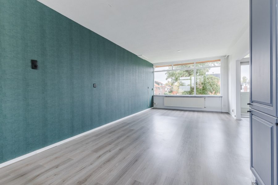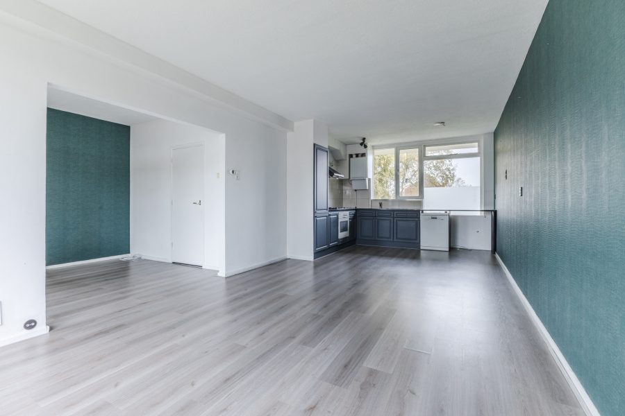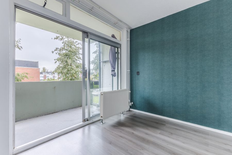 De woonkamer vormt het hart van het appartement en is afgewerkt met een fraaie vloer en strakke wanden. Het is een gezellige leefruimte waar genoeg plek is voor een zit- en eethoek. De grote raampartijen en schuifpui naar het balkon zorgen hier voor een overvloed aan natuurlijk licht. Het balkon biedt ruimte voor een gezellige zithoek en is nog geheel naar eigen smaak in te richten. Het is een heerlijke plek om van het mooie weer en het uitzicht op de groene omgeving te genieten.