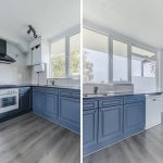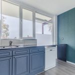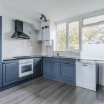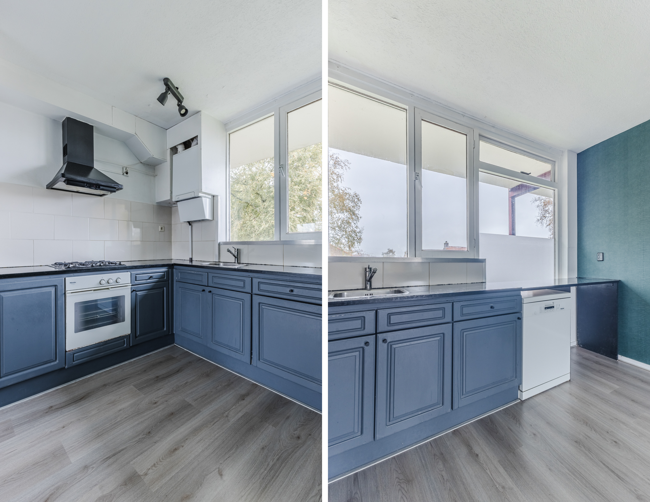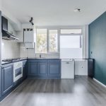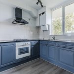 De ruim opgezette, open keuken is uitgevoerd in een hoekopstelling. Het geheel heeft een mooi design met donkerblauwe keukenkastjes, een donker werkblad en een wit achterblad. Hier tref je de volgende apparatuur aan: gasfornuis, afzuigkap, oven, koelkast en vriezer.