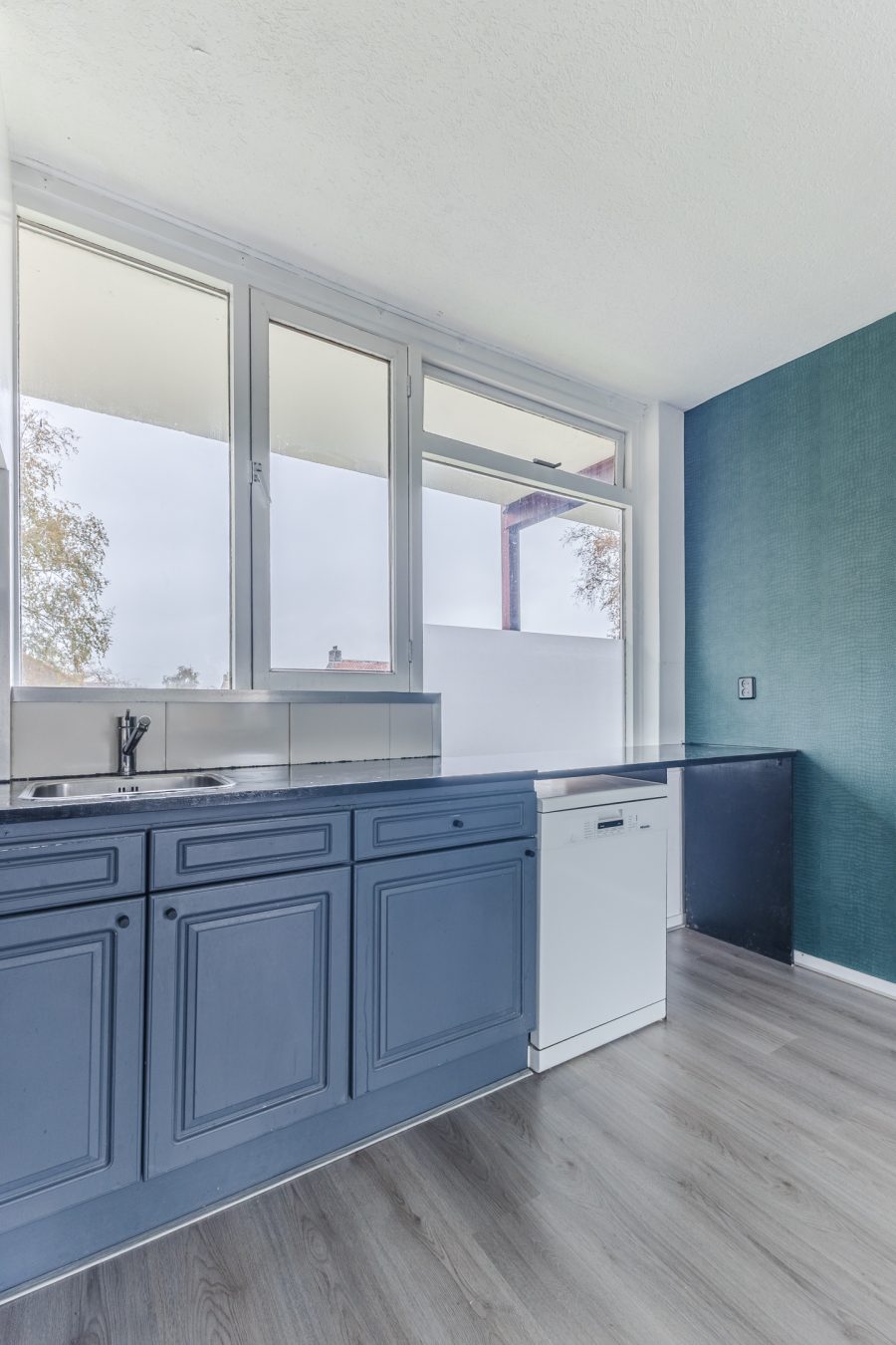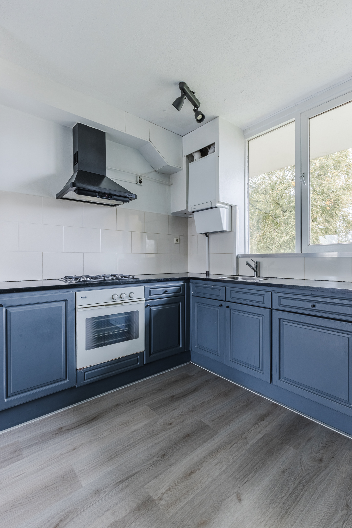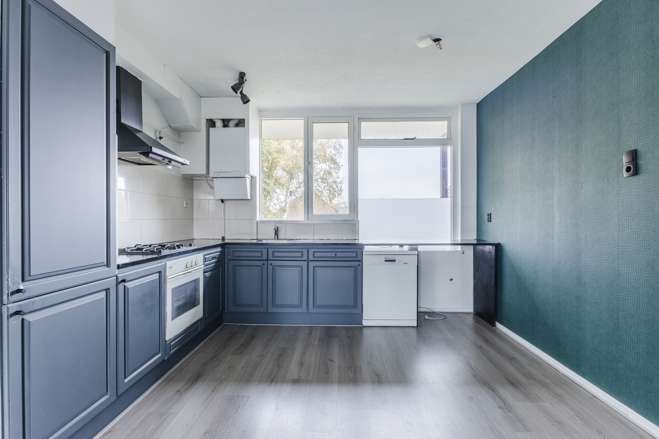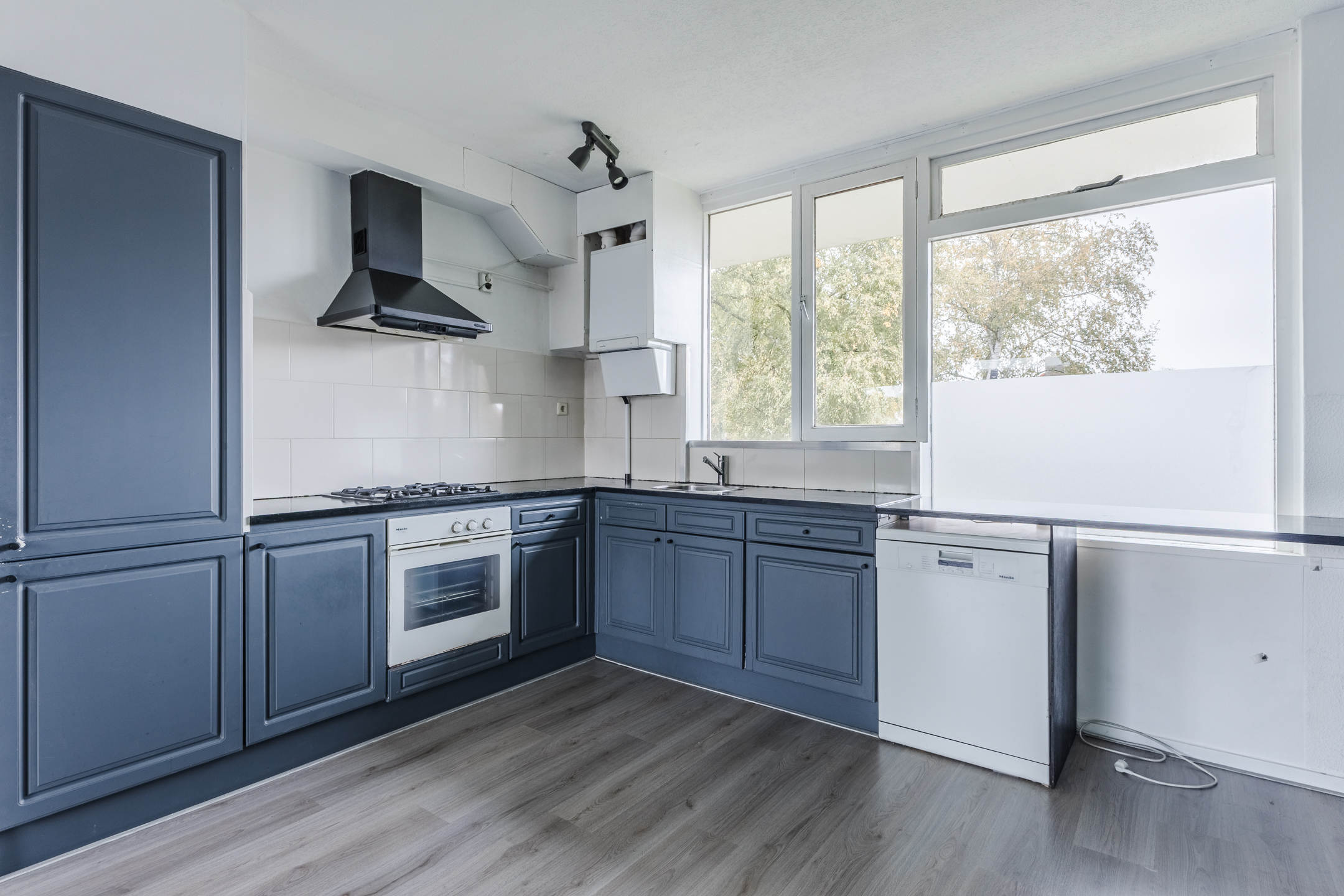 The spacious, open kitchen has a corner layout. The whole has a beautiful design with dark blue kitchen cabinets, a dark worktop and a white backsplash. Here you will find the following appliances: gas stove, extractor hood, oven, refrigerator and freezer.