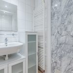 • Neat bathroom with sink, designer radiator and shower