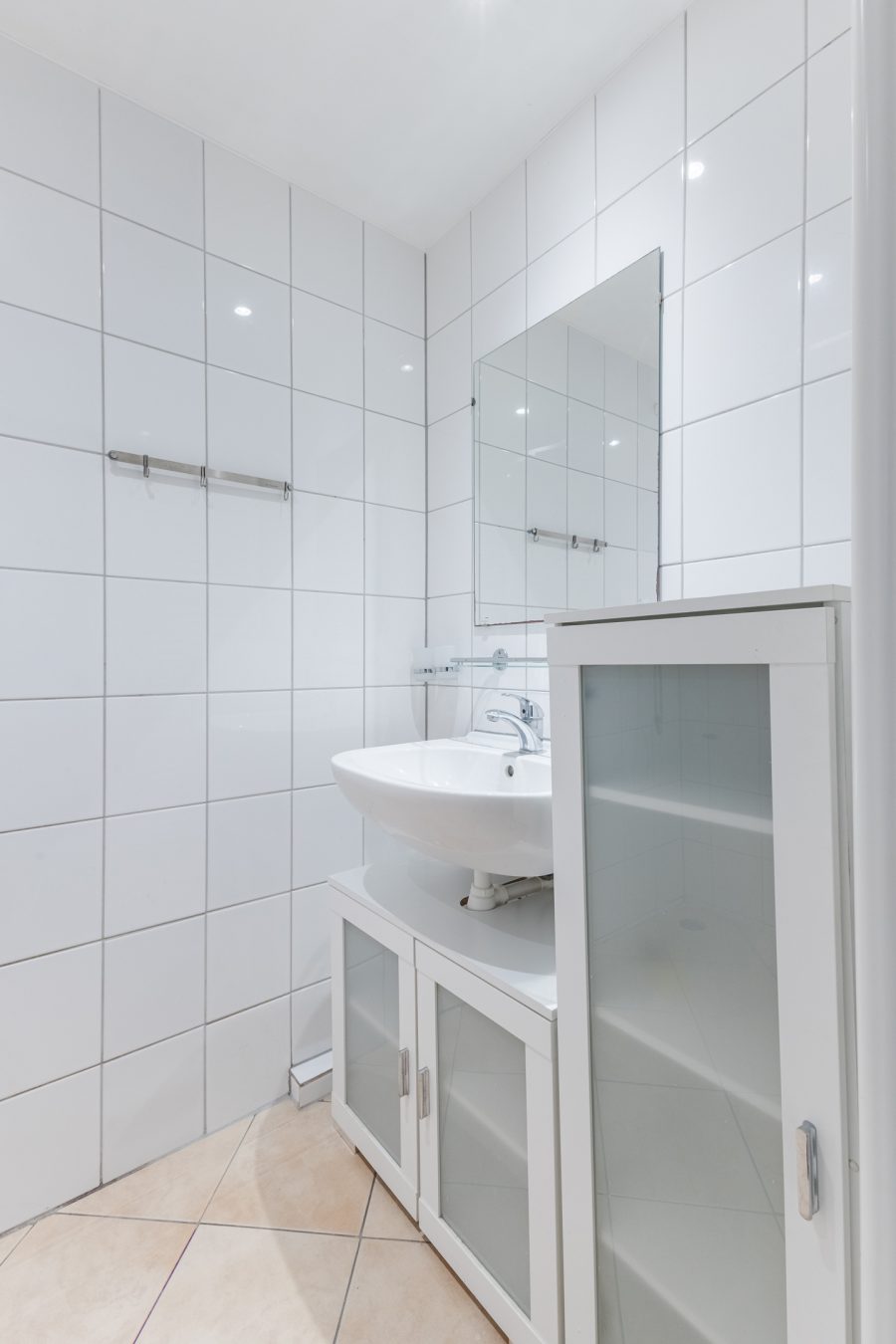 In the apartment you will find two bedrooms. Both bedrooms are spacious and enjoy plenty of natural light. The neat bathroom is finished with beige floor tiles and white wall tiles. This room is equipped with a sink, designer radiator and shower. Recessed spotlights have been chosen for lighting. The apartment has a separate toilet.