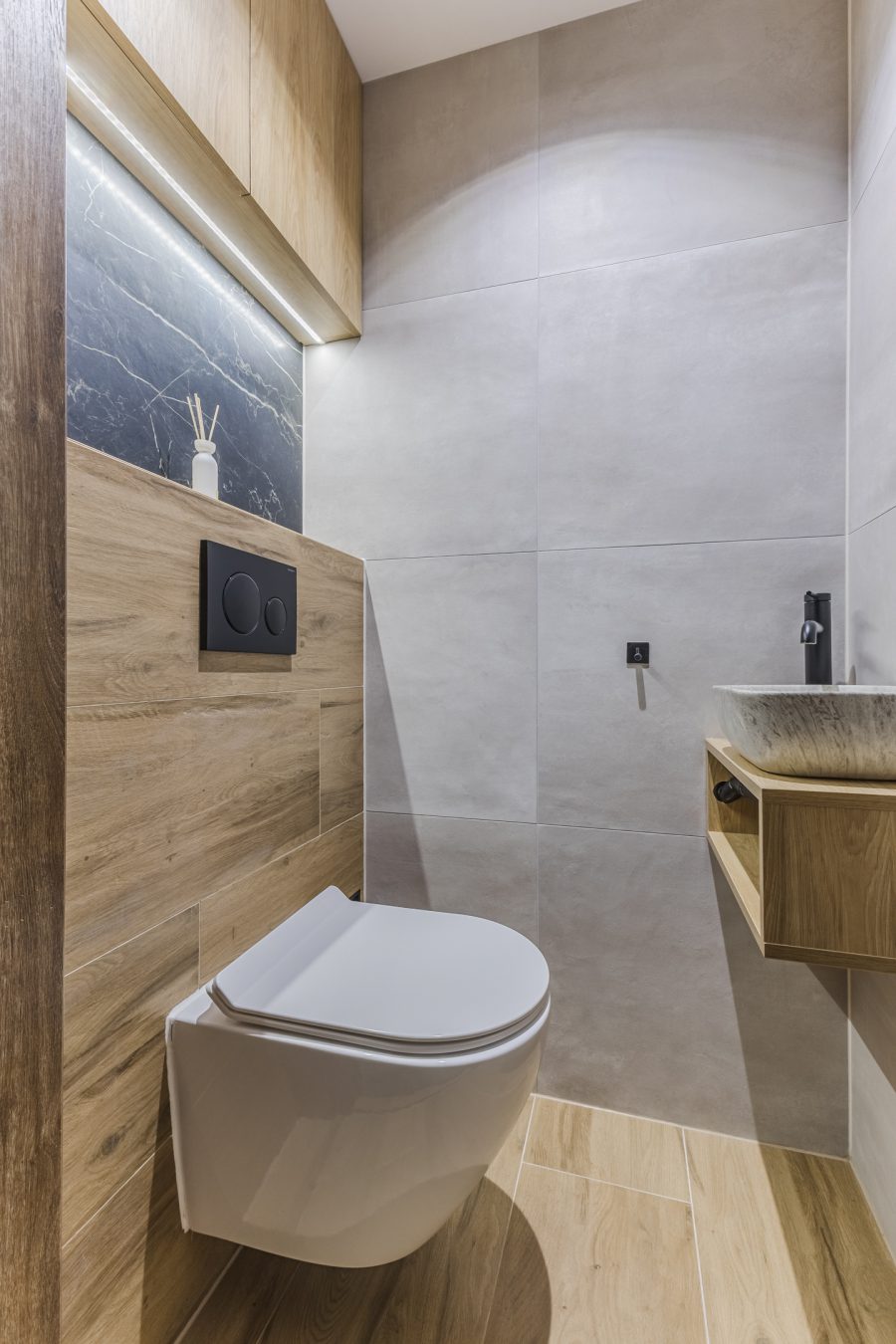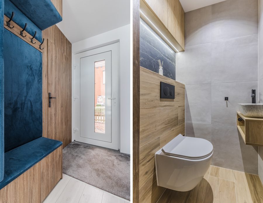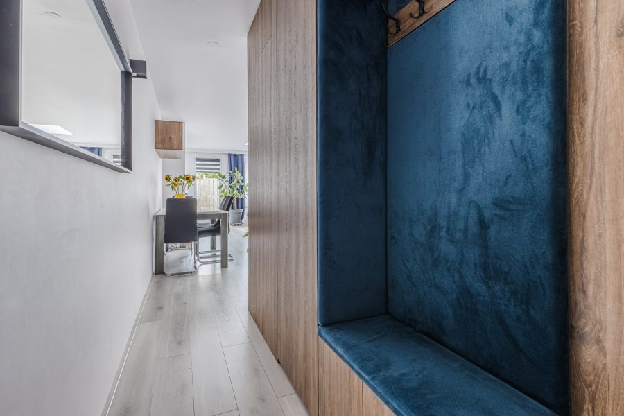 The garden path in the front yard leads to the beautiful front door of this charming house. Upon entering, you are welcomed into a beautifully finished entrance hall with a coat closet, meter cupboard and storage cupboard. The entrance also provides access to the living room and a modern toilet room with a floating toilet and washbasin.