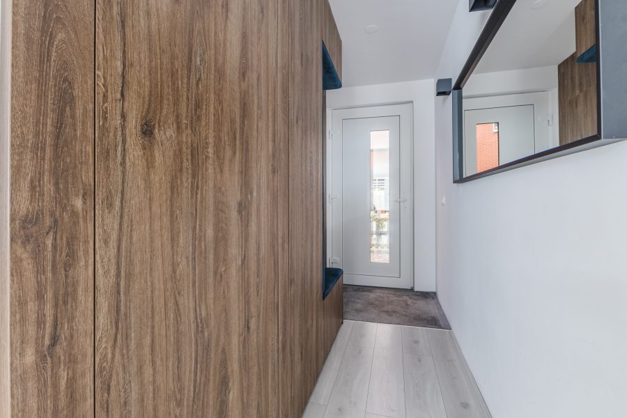 Via het tuinpad in de voortuin bereik je de prachtige voordeur van deze charmante woning. Na binnenkomst word je verwelkomd in een fraai afgewerkte entreehal met garderobe, meterkast en bergkast. Verder biedt de entree toegang tot de woonkamer en een moderne toiletruimte met zwevend toilet en fonteintje.