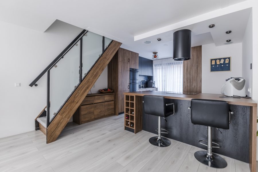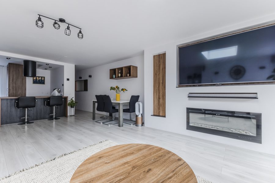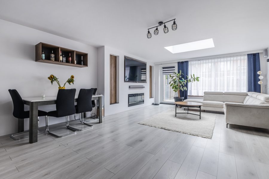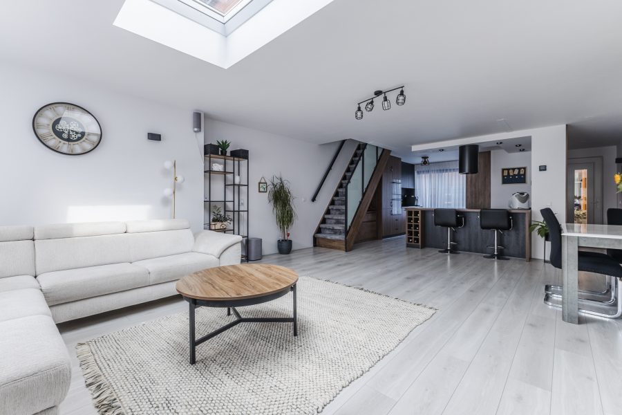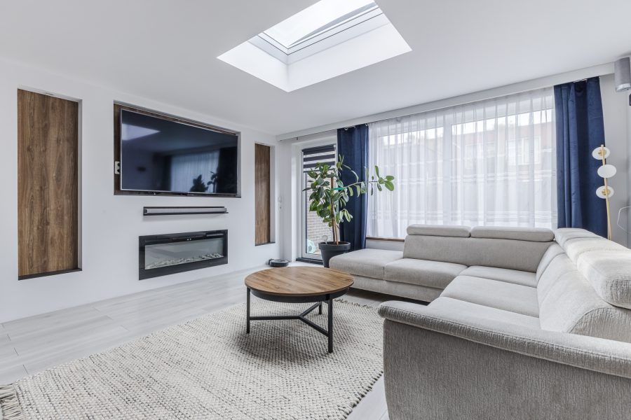 The spacious and luxuriously finished living room has beautiful flooring with underfloor heating and sleek walls. Thanks to the large windows and skylight (with rain sensor), the living room enjoys wonderful natural light. The built-in electric fireplace gives the room a warm and cozy atmosphere. The staircase to the first floor is located in the living room.