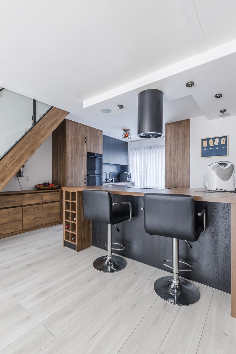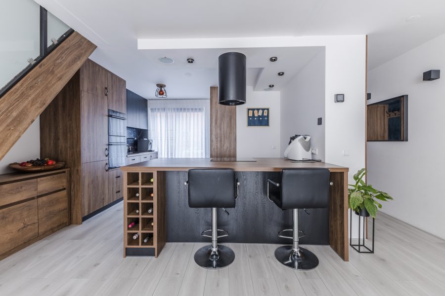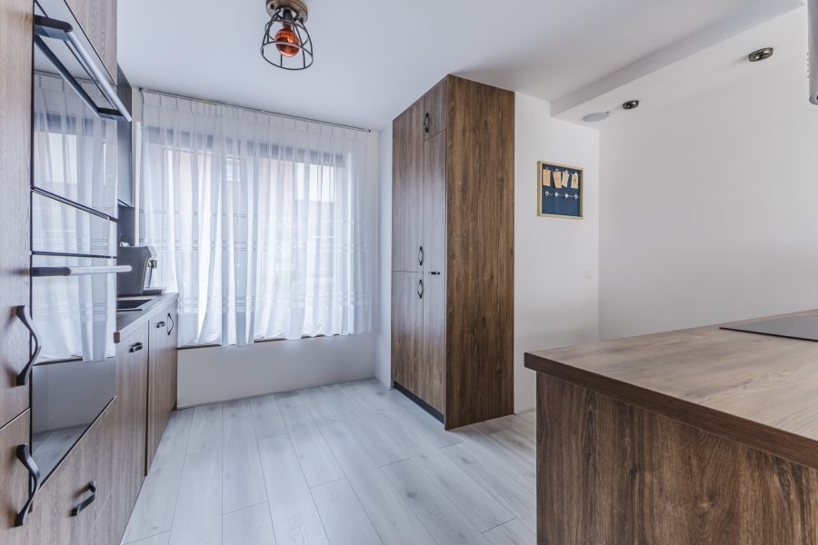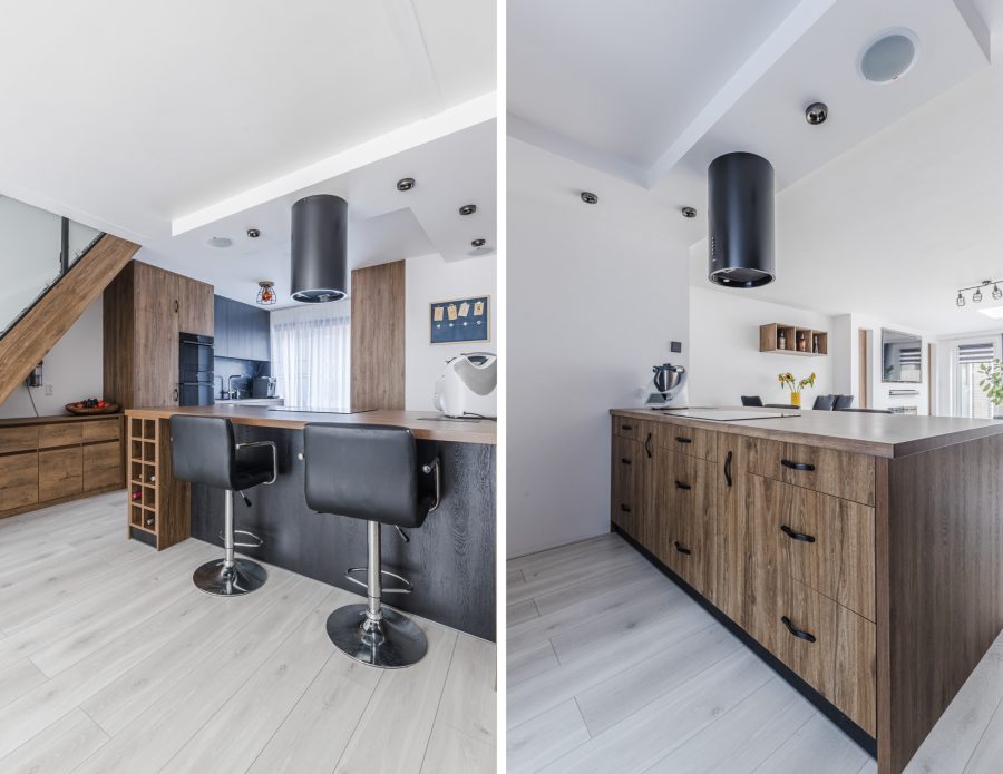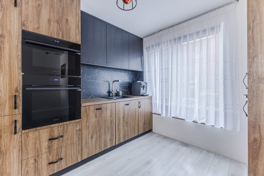 De prachtige keuken (2023) bevindt zich aan de voorzijde van het huis en bestaat uit een keukenblok, hoge kasten en een kookeiland. Het geheel is luxe afgewerkt met houtkleurige en zwarte keukenkastjes. De keuken is uitgerust met de volgende moderne apparatuur: vaatwasser, inductiekookplaat, afzuigkap, ovens, koelkast en vriezer. Er is volop kastruimte aanwezig, waaronder diverse lades.