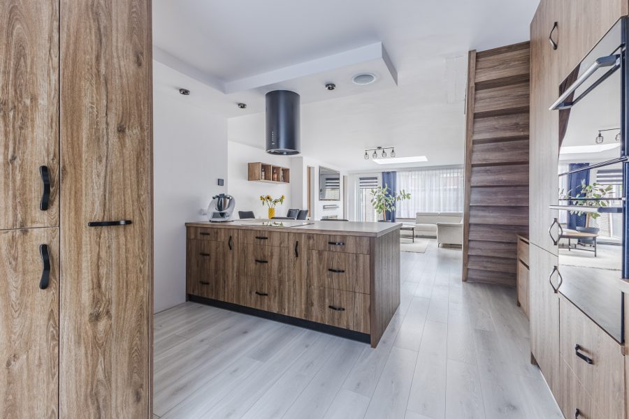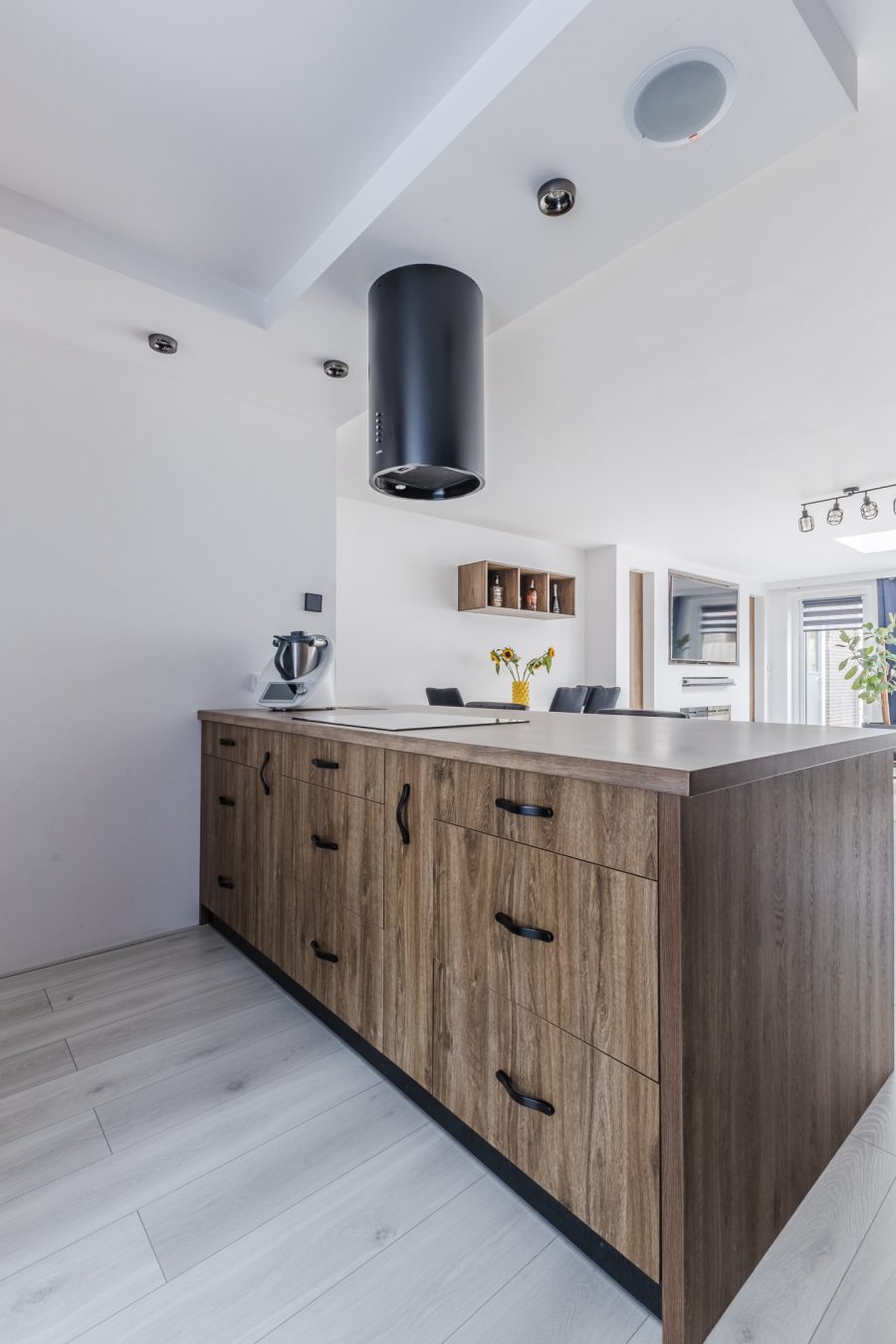 You will find the beautiful kitchen (2023) at the front of the house. This kitchen consists of a kitchen unit, tall cabinets and a cooking island. The whole is luxuriously finished with wood-colored and black kitchen cabinets. The kitchen is equipped with the following modern appliances: dishwasher, induction hob, extractor hood, ovens, refrigerator and freezer. There is plenty of cupboard space, including various drawers.