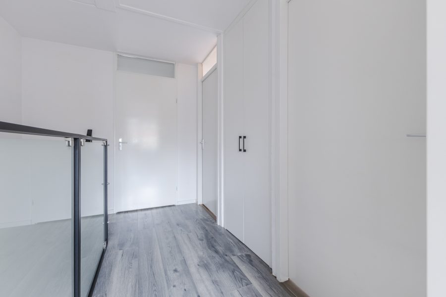 Through the stairs in the living room, you can reach the spacious landing on the first floor. From here you can access a practical storage cupboard, three bedrooms and a bathroom. Of the three bedrooms, two are at the back and one is at the front. All bedrooms are spacious, nicely finished and wonderfully light.
