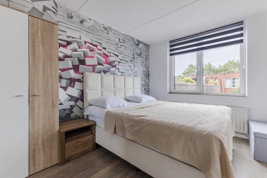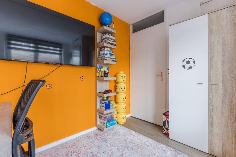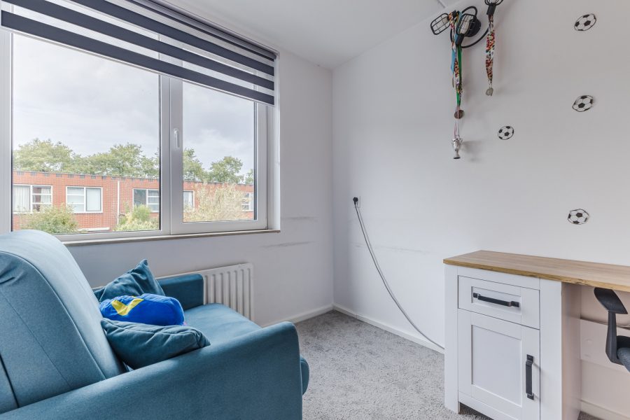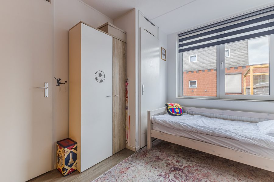 Via de trap in de woonkamer kom je op de ruime overloop van de eerste verdieping. Vanuit hier bereik je een praktische bergkast, drie slaapkamers en een badkamer. Van de drie slaapkamers liggen er twee aan de achterzijde en één aan de voorzijde. Alle slaapkamers zijn ruim opgezet, keurig afgewerkt en heerlijk licht.