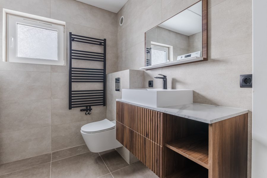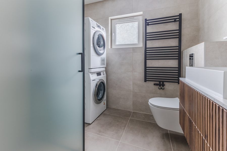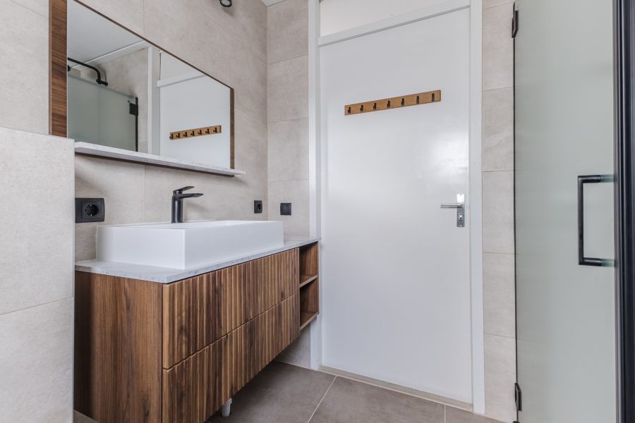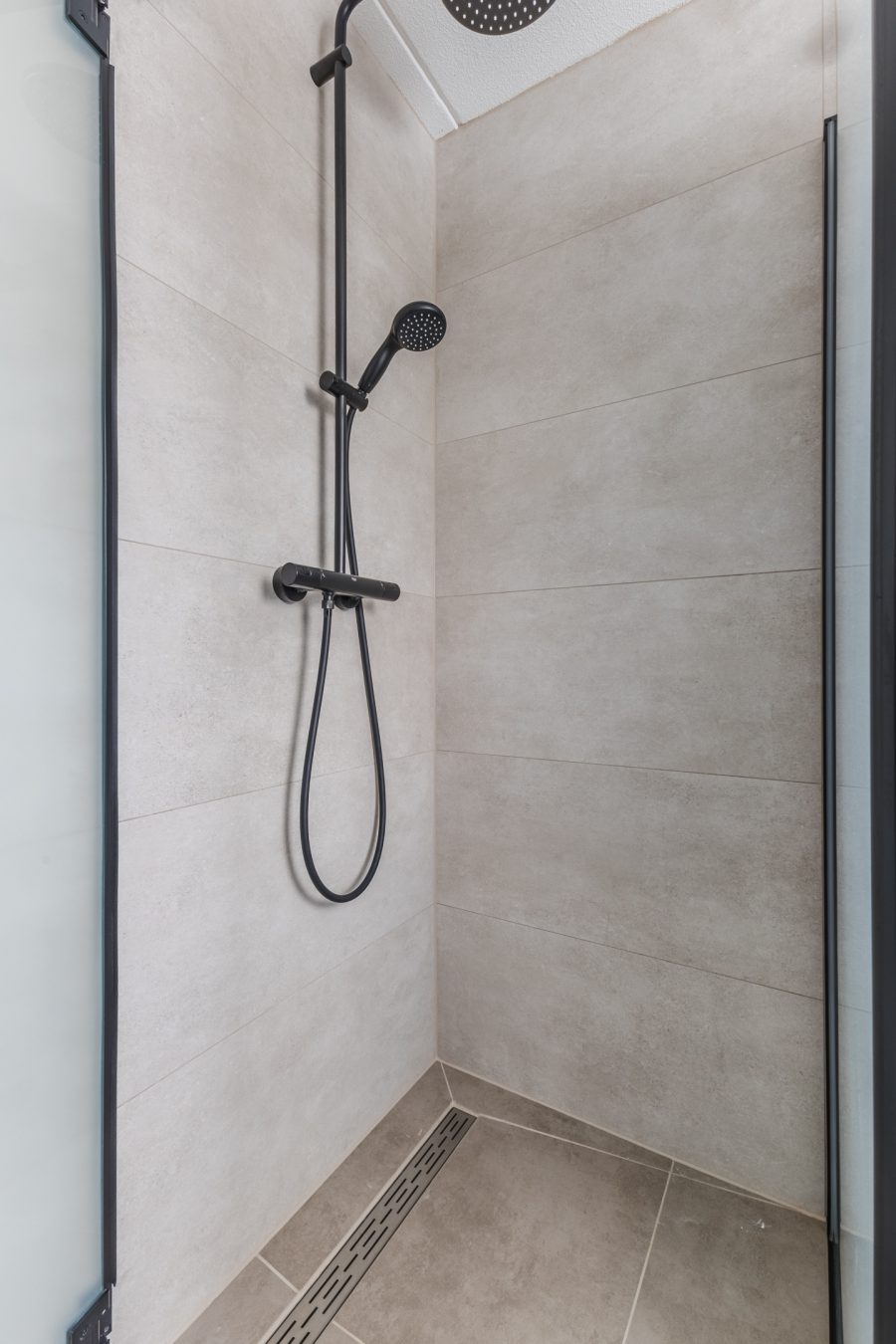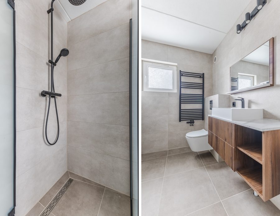 De badkamer is slechts drie maanden oud en luxe afgewerkt met moderne tegels. Deze ruimte is uitgerust met een zwevend toilet, badmeubel met wastafel, designradiator en een inloopdouche met regen- en handdouche. Ook de wasmachine- en drogeraansluitingen zijn hier te vinden.