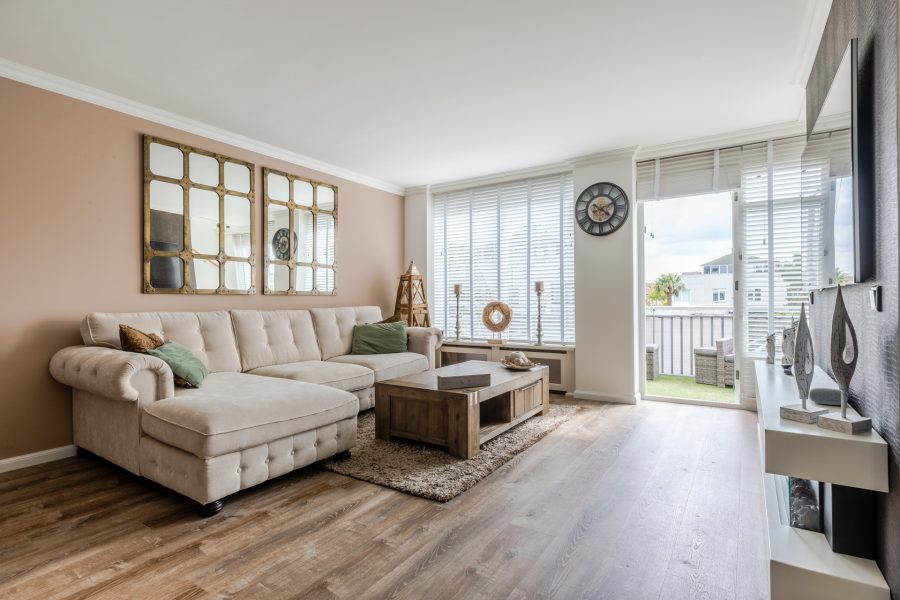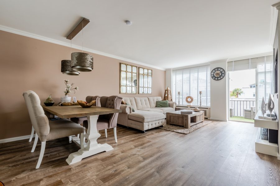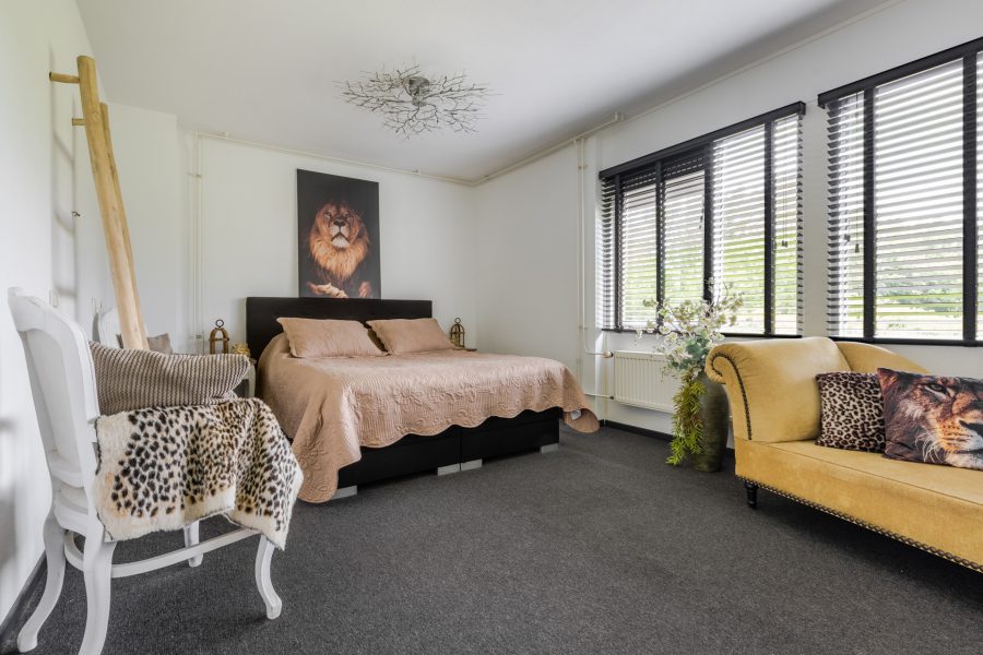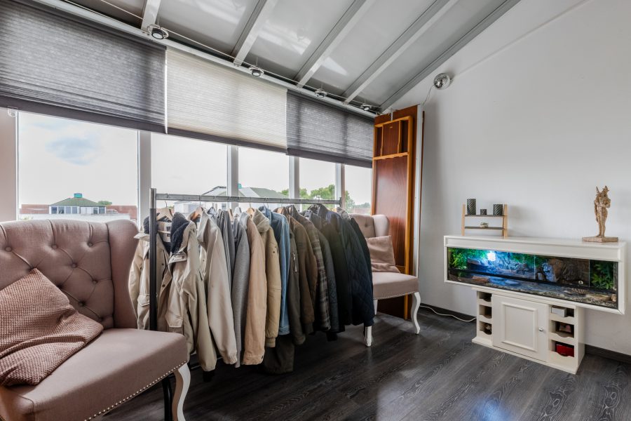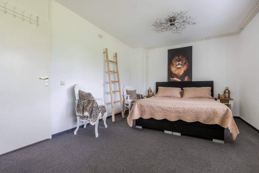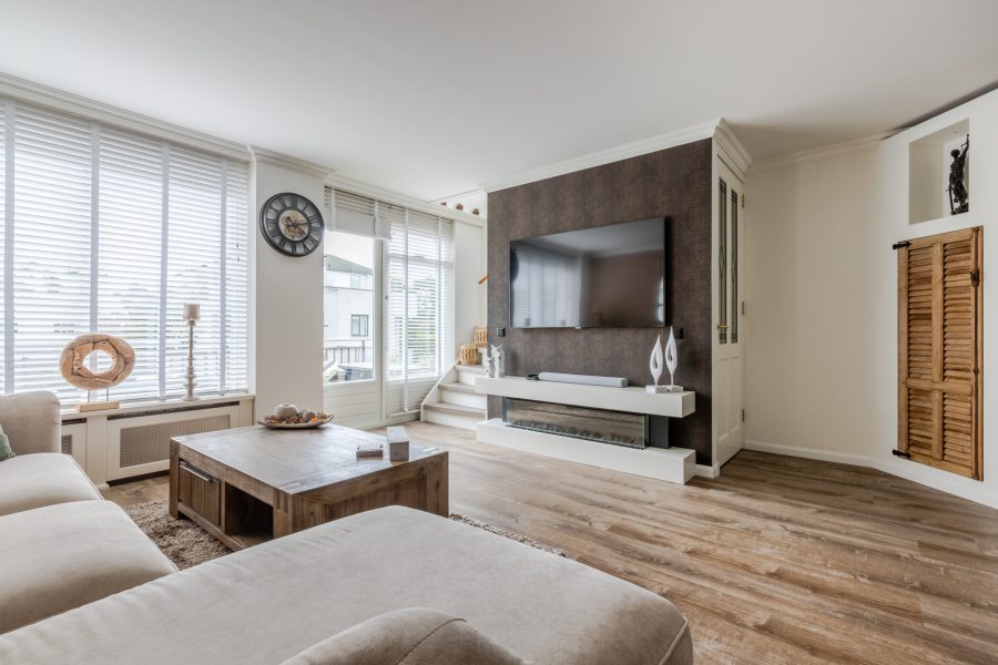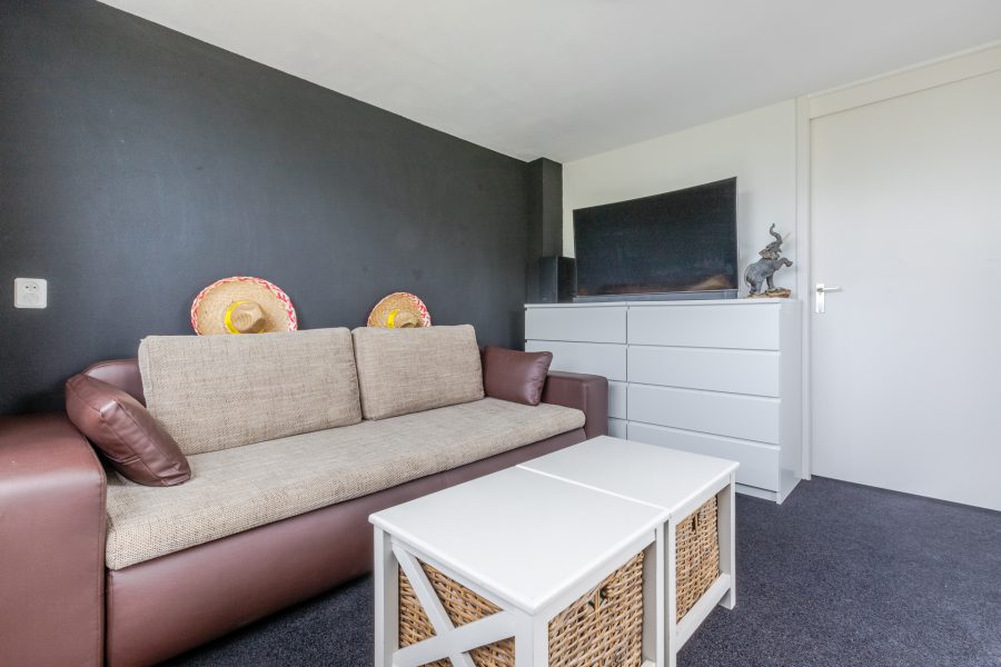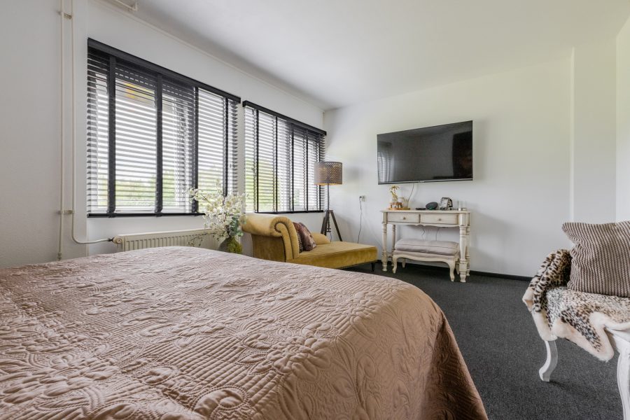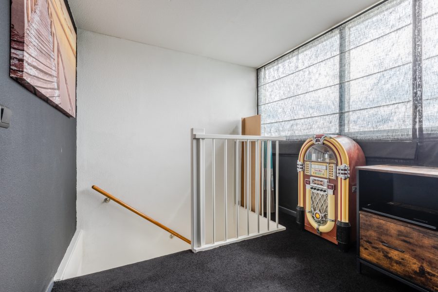 Via the stairs you reach the landing of this floor. Here you will find a spacious living room with open kitchen and a separate toilet with hand basin. The stylish U-shaped kitchen is located at the rear and is equipped with modern appliances and a breakfast bar. At the rear is a window with a French door. At the front there are also two windows with an access door to a spacious balcony, where you can create a nice lounge area. You have unobstructed views here. The balcony is equipped with an automatic sunshade. The room is large enough for a spacious seating area, cinewall and a large dining table. The floor is heated.