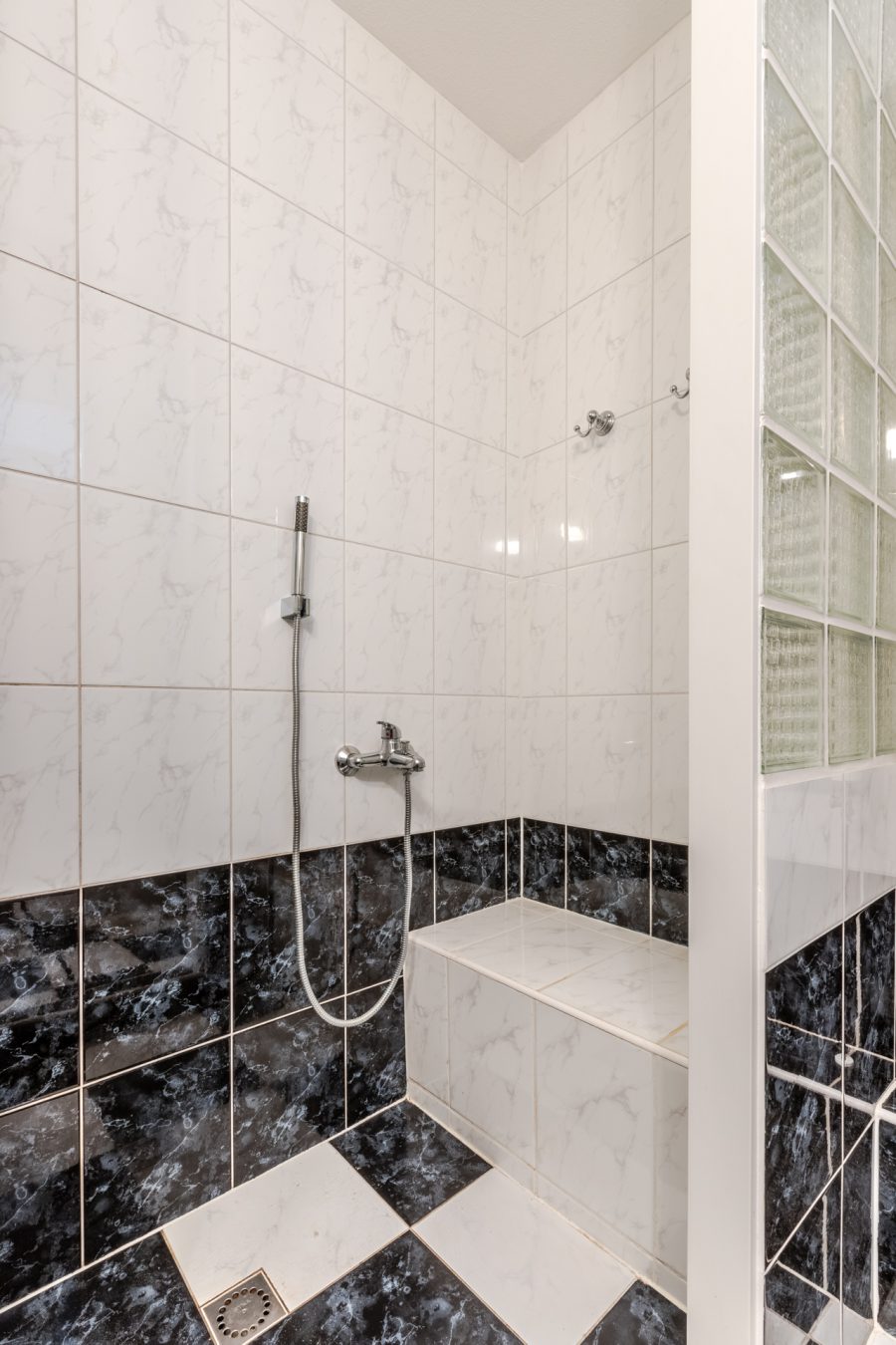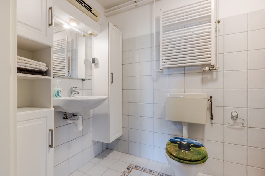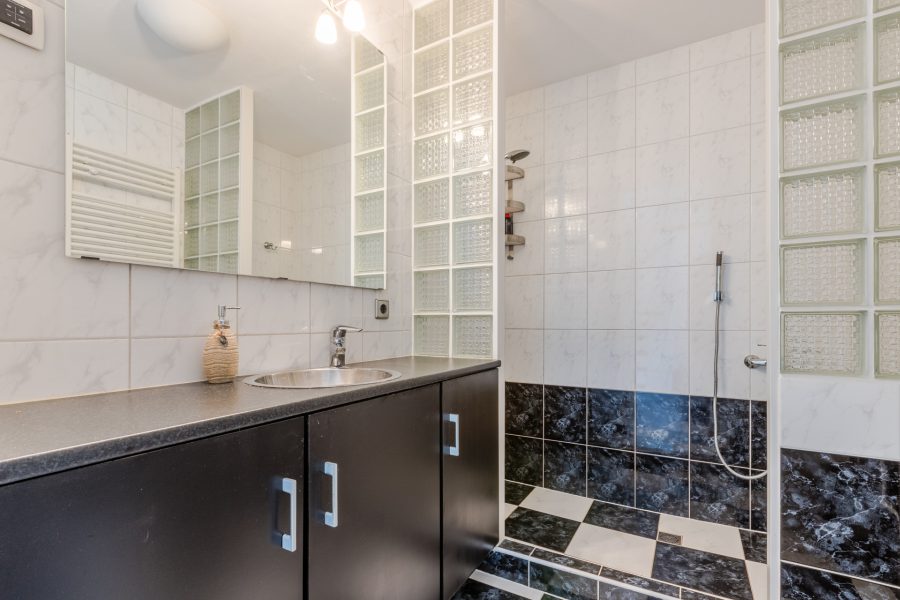 We park the car on the private car park and through the paved garden with possibility for a covered lounge area we reach the door with access to the ground floor of the house. Here we find a storage closet, a hobby-/bedroom, storage space and a bathroom. Currently a home cinema has been realised here. The bathroom contains a washbasin with mirror, a vanity unit, a toilet and a shower. The staircase to the first floor is also located here.