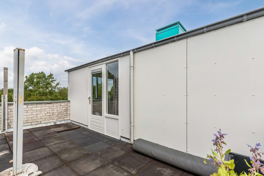 Hier is slaapkamer nummer vier te vinden met toegang tot een ruim dakterras. Ook tref je hier een ruime overloop aan met een luik met toegang tot een bergvliering.