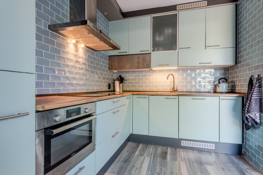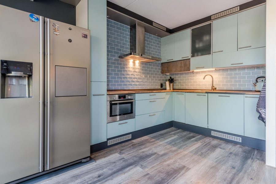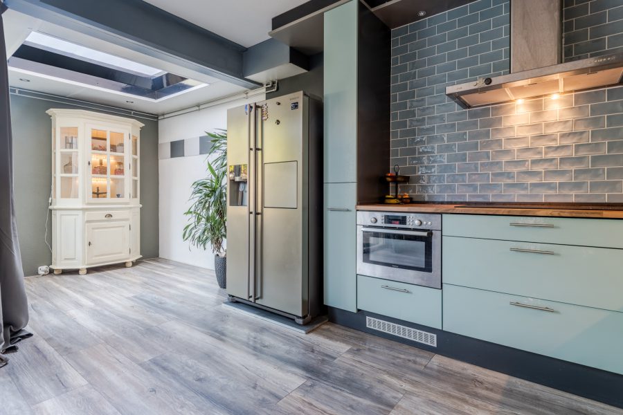 Through the pavement and the hedged and tiled front garden we reach the front door of the house. Entrance with meter closet and wardrobe and draught door to the hall. In the hall you will find the floating toilet with hand basin, staircase to the first floor and access to living room with open kitchen. The living room has wide windows at the front and an extension with skylight at the back, adjacent to the kitchen. A glass front and French doors to the garden complete the living room's beautiful light. At the front is room for a seating area and at the back, near the kitchen, you can place a large dining table overlooking the garden. At the back of the living room, the open kitchen is also located. The L-shaped kitchen has mint green fronts and is equipped with various built-in and separate appliances. You cook electric here. There is a nice laminate floor and the walls and ceilings are neatly finished. There are tiles on the floor in the hallway.