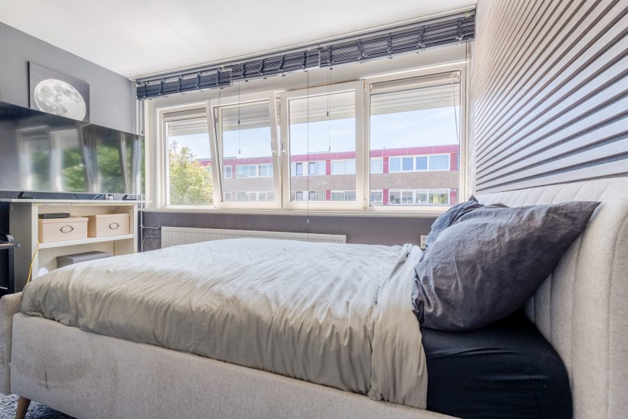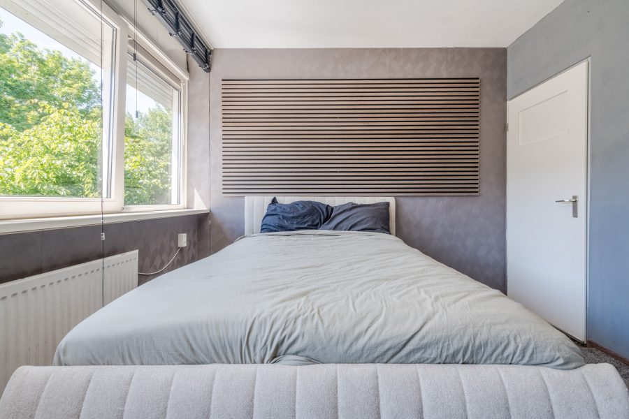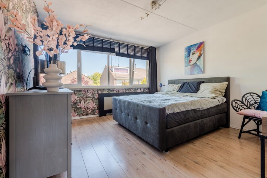 Via de gestoffeerde trap bereiken we de overloop van deze verdieping. Hier treffen we vier fijne slaapkamers en een stijlvolle badkamer aan. Twee slaapkamers liggen aan de achterzijde en twee aan de voorzijde van de verdieping. Alle slaapkamers zijn keurig afgewerkt. Eén slaapkamer is nu in gebruik als inloopkast. De stijlvolle badkamer is voorzien van een breed badmeubel met verlichte spiegel en een luxe, brede inloopdouche met mengpaneel. Op deze verdieping tref je ook een separaat toilet.