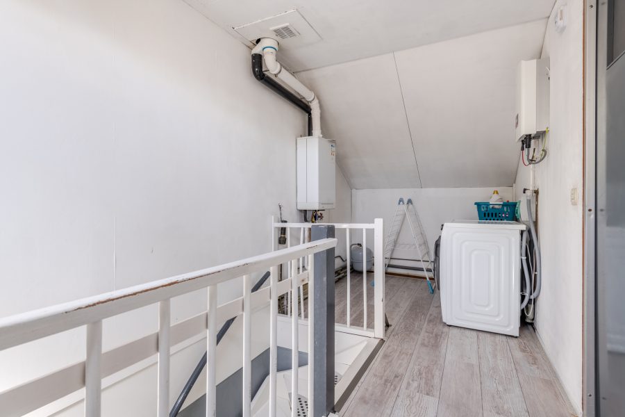 Via the open staircase we reach this floor where the spacious, excellently finished fifth bedroom can be found, as well as plenty of storage space. The bedroom is large enough to create a nice home office or to pursue a hobby. The landing has room for the connection for washer and dryer and the central heating system.