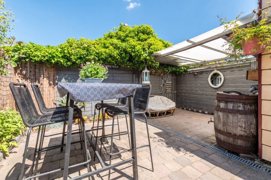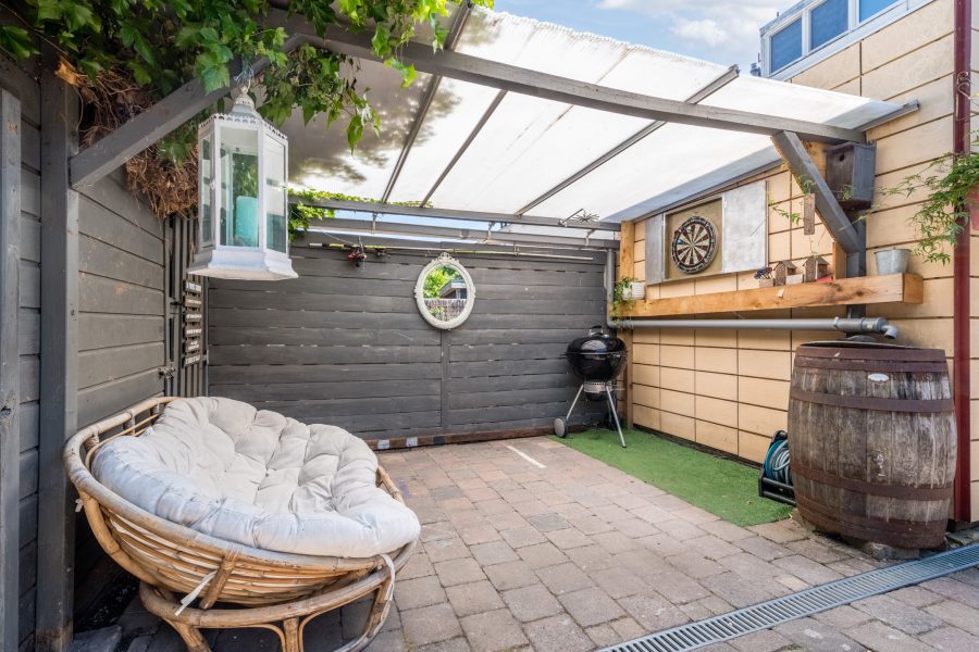 The property has a fenced, paved, sunny front garden. You can create a seating area here. Attached to the house is an awning, so you can also sit here in the shade. The deep back garden is partly paved and partly has a green border with perennials. Attached to the house is a spacious shed with a canopy. Here there is room for a nice lounge area. The garden is large enough to place a dining table outside for cosy summer meals. There is a back entrance.