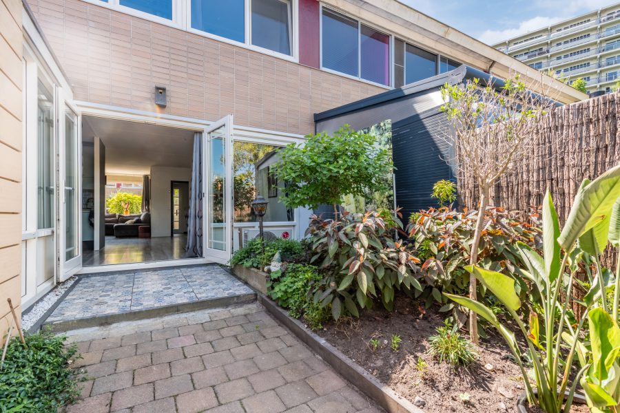 De woning heeft een omhaagde, bestrate, zonnige voortuin. Je kunt hier een zitje realiseren. Aan de woning vast zit een zonwering, zodat je hier ook in de schaduw kunt zitten. De diepe achtertuin is deels betegeld en is deels voorzien van een groene border met vaste planten. Aan de woning vast tref je een ruime berging aan met overkapping. Hier is plaats voor een fijne loungeplek. De tuin is groot genoeg om een eettafel buiten te plaatsen om in de zomermaanden gezellig buiten te eten. Er is een achterom.