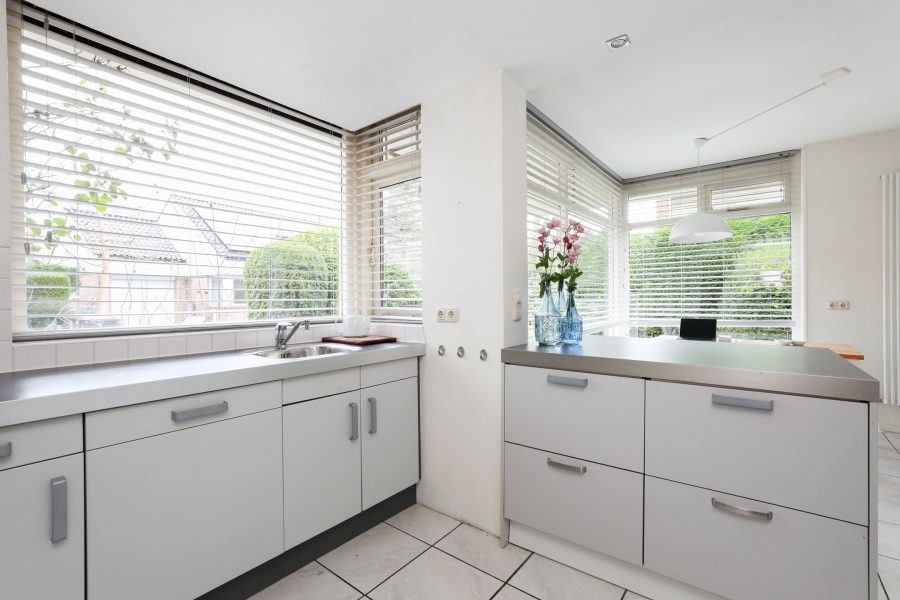 Via de entree kom je in de hal met toilet, berging, trapopgang en toegang tot de lichte woon- en eetkamer. De royale living met grote ramen zorgt voor veel natuurlijk licht en heeft een prettige indeling. De eetkamer loopt vloeiend over in de eerste, moderne keuken, die is voorzien van diverse inbouwapparatuur en voldoende opbergruimte. Een ideale plek om te koken en gezellig samen te zijn met familie of vrienden.