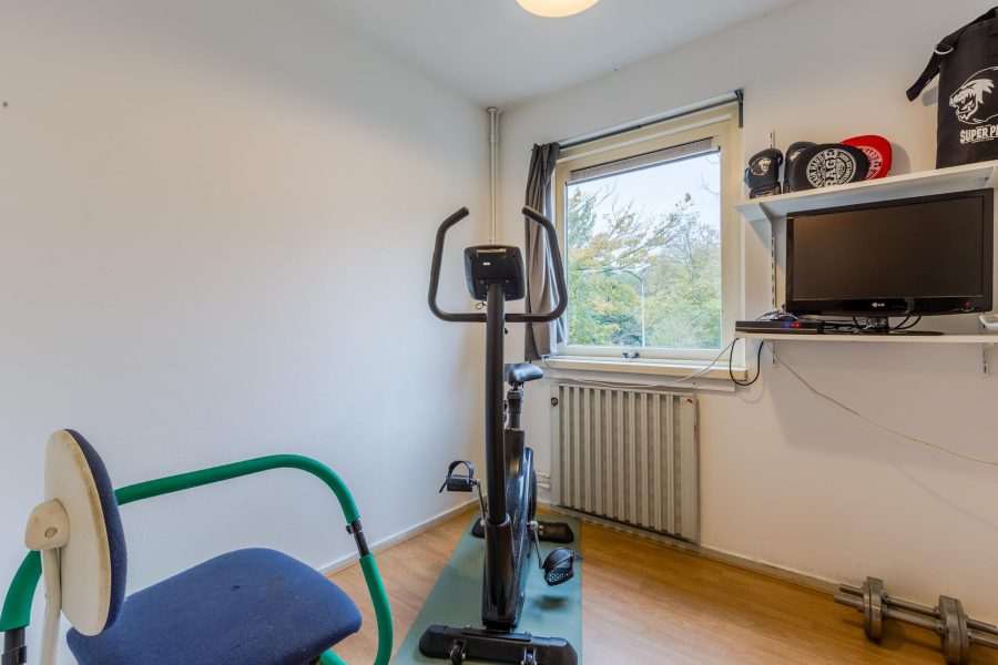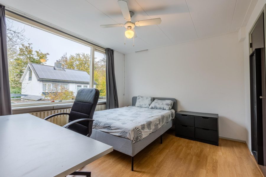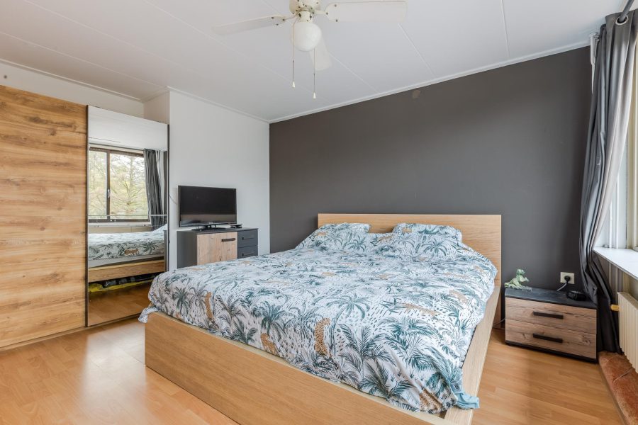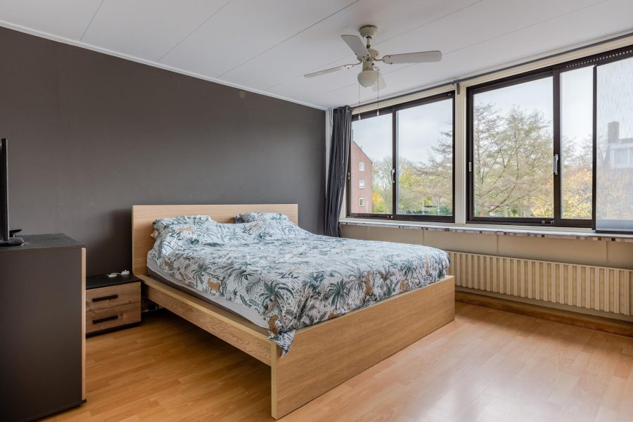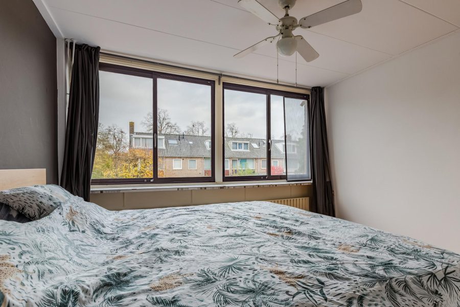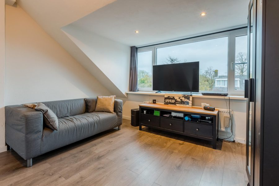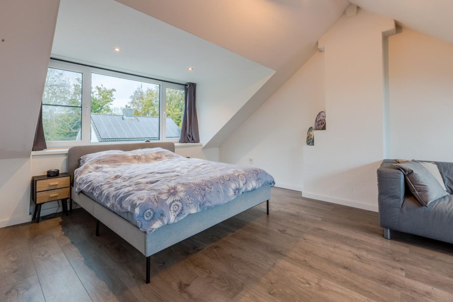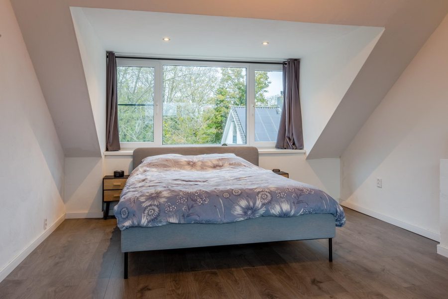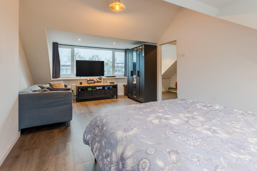 Via de open trap bereiken we de overloop van deze verdieping. De verdieping heeft zowel voor als achter een dakkapel. Hier is een ruime, keurig afgewerkte 4e slaapkamer te vinden. De lichte slaapkamer loopt van voor naar achter op de verdieping, Er is hier ruimte genoeg voor een 2-persoonsbed, een zithoek en/of werkplekken. Op de overloop vind je de aansluiting voor het witgoed, de cv-installatie en een wastafel.
