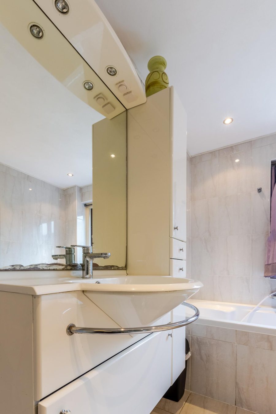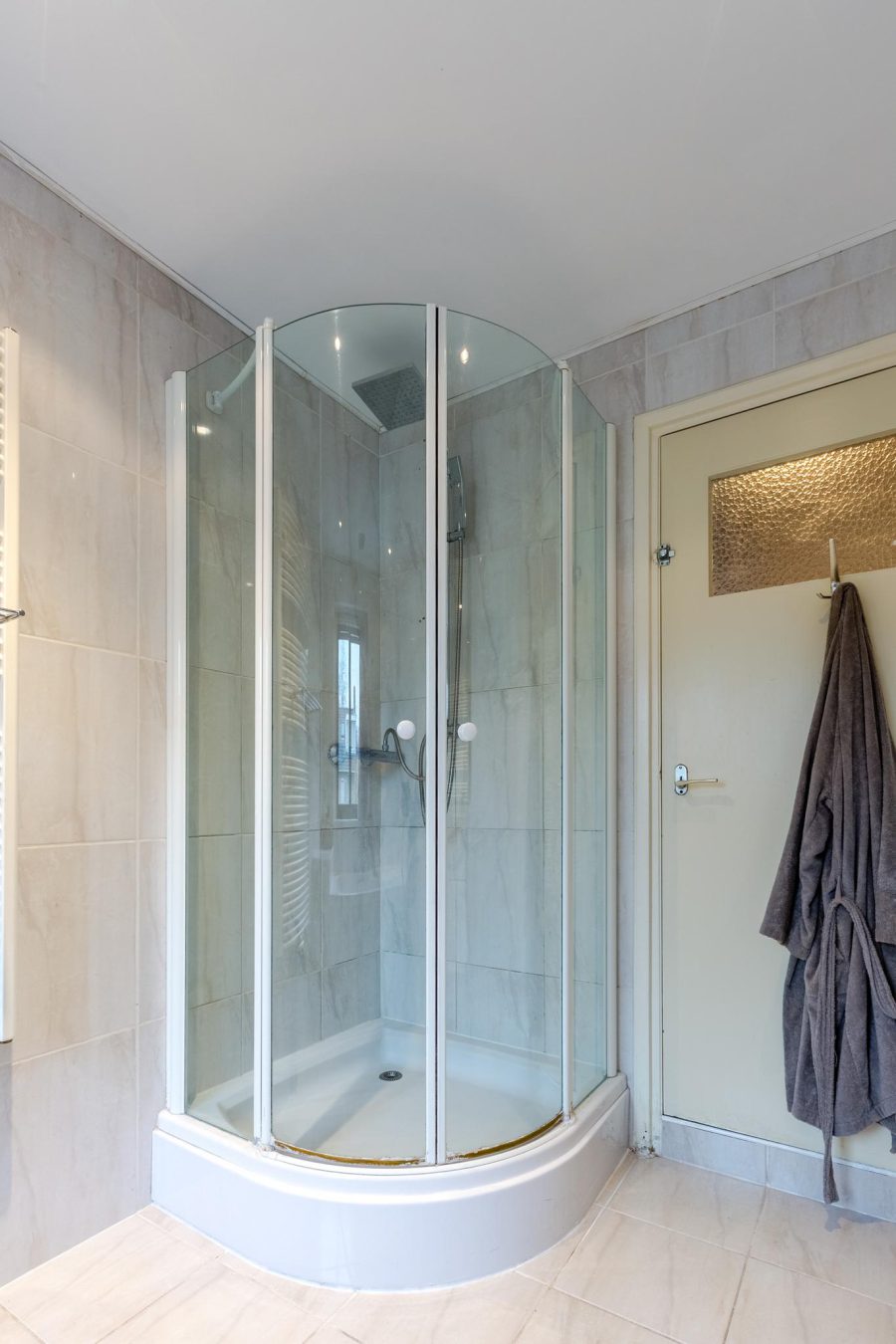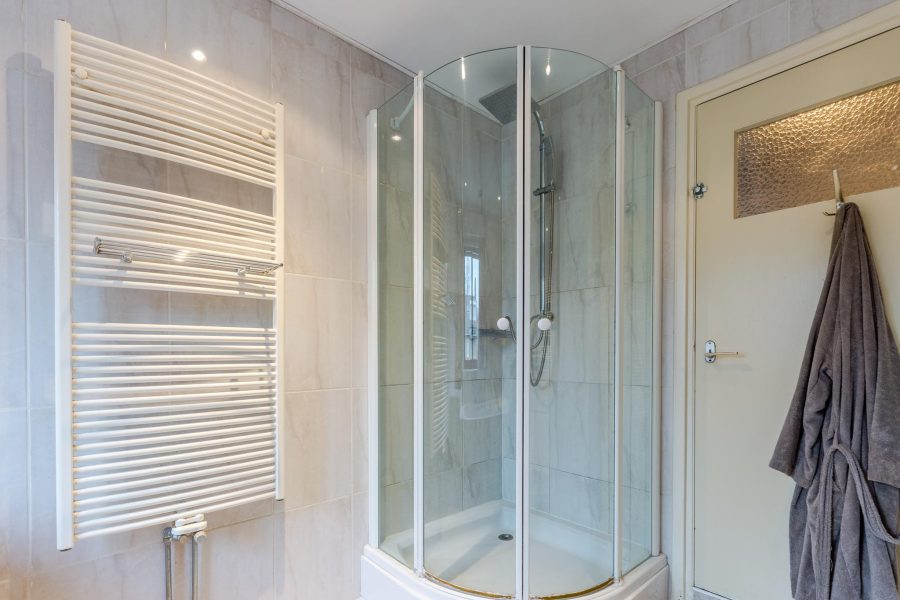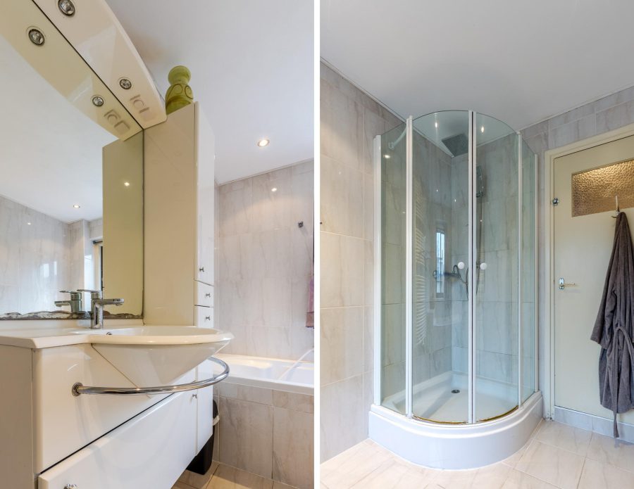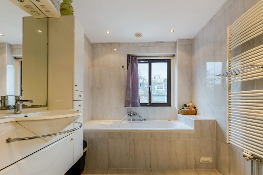 Through the stairs we reach the landing of this floor. Here we find three bedrooms and the bathroom. The largest bedroom is at the rear, next to the bathroom, and the other two bedrooms are at the front. The largest bedroom at the front has a closet. The bathroom (2002) is equipped with a vanity unit with sink and mirror, recessed spotlights, a design radiator, a bathtub and a corner shower cabin with hand and rain shower.