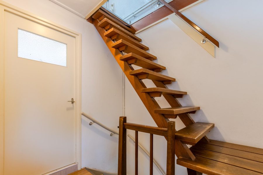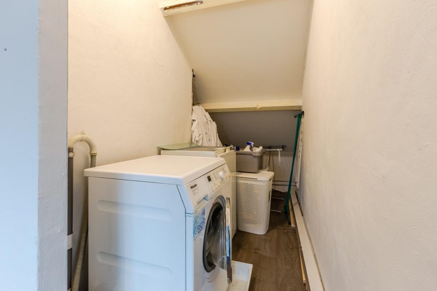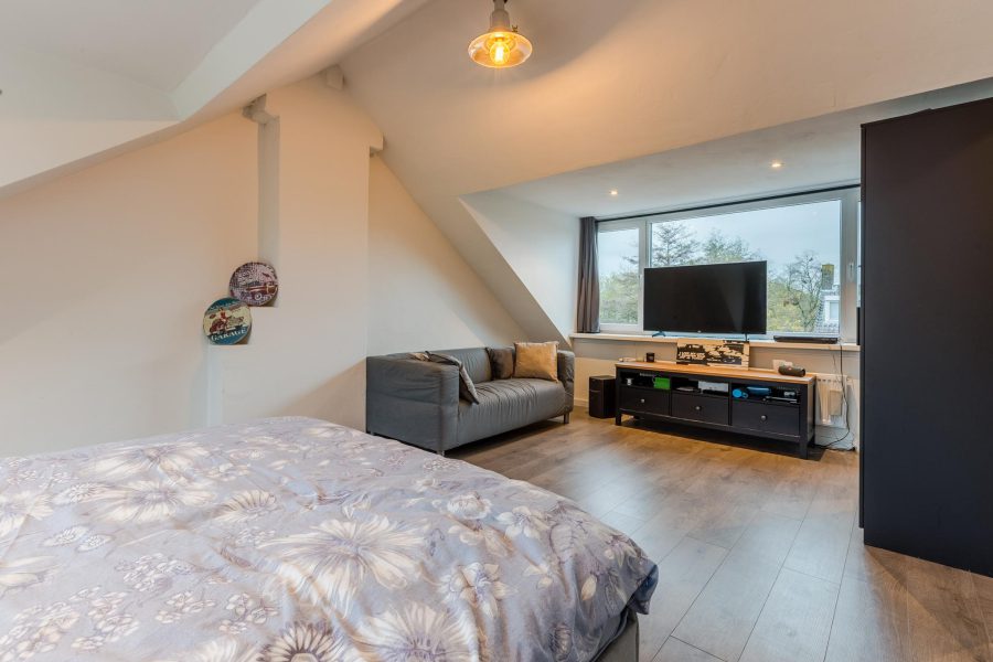 Through the open staircase we reach the landing of this floor. The floor has both front and rear dormer windows. Here a spacious, nicely finished 4th bedroom can be found. The bright bedroom runs from front to back on the floor, There is space enough here for a double bed, a sitting area and / or workstations. On the landing you will find the connection for washer and dryer, the central heating system and a sink.