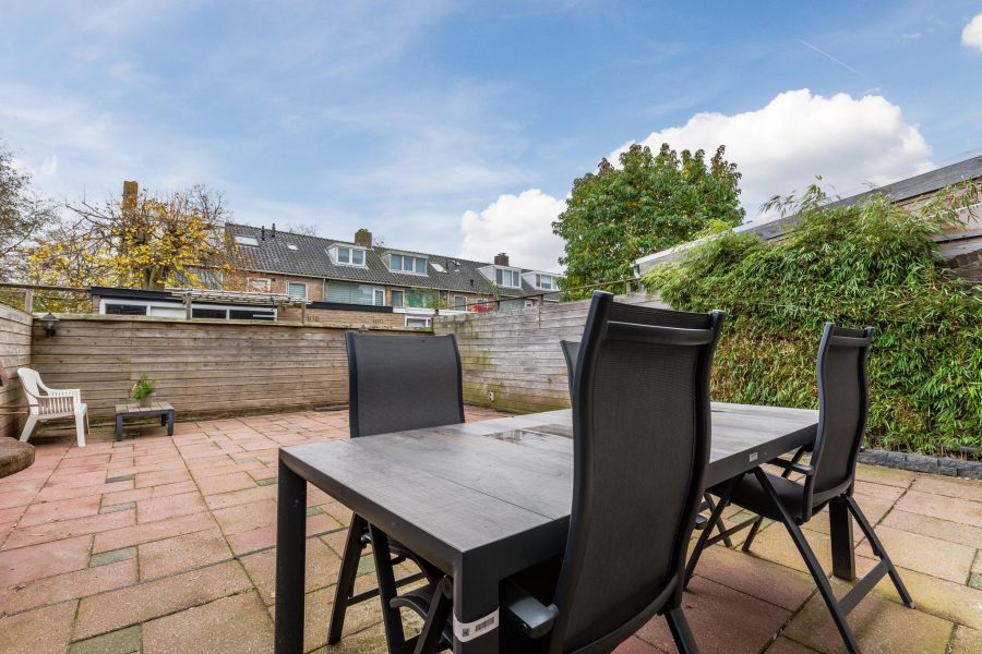 De woning heeft een deels groene en grotendeels betegelde voor-, zij- en achtertuin. De diepe, beschutte achtertuin is geheel betegeld en aan de woning vast bevindt zich een terras. Hier kun je een grote eettafel plaatsen om gezellig met familie en vrienden te eten in de zomermaanden. Aan de woning bevindt zich een buitenzonnewering. De tuin is groot genoeg om er ook een fijne loungehoek te realiseren. Er is een achterom.