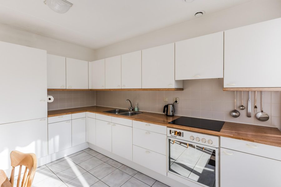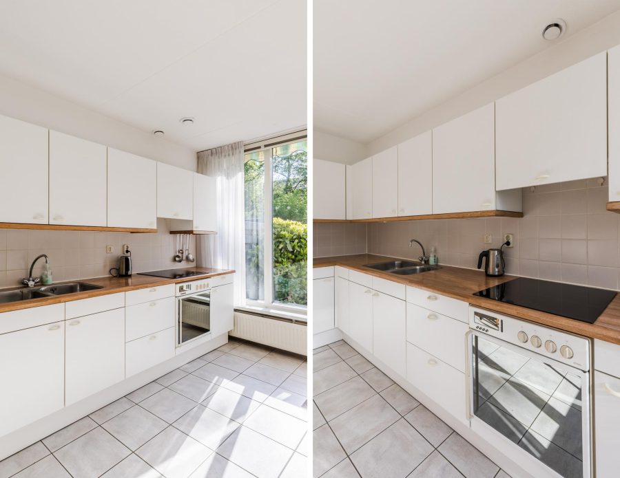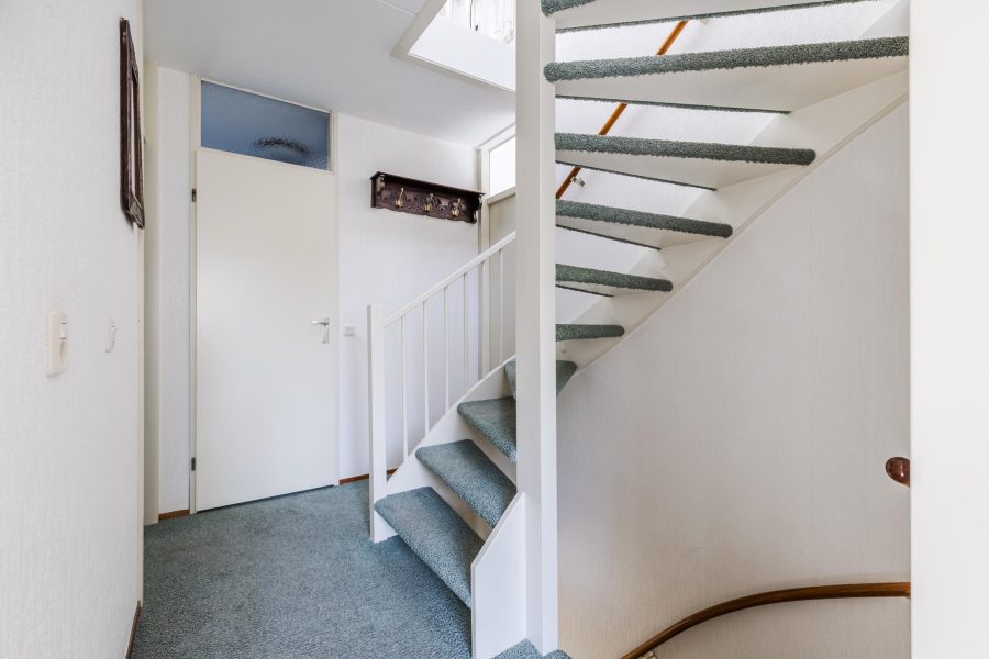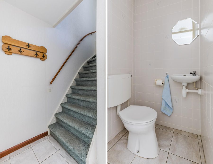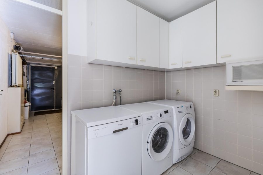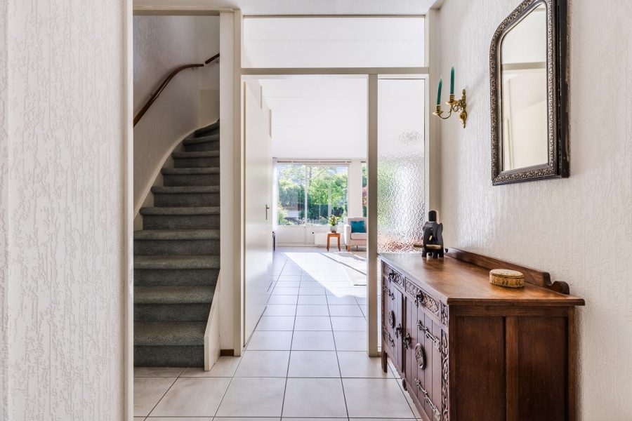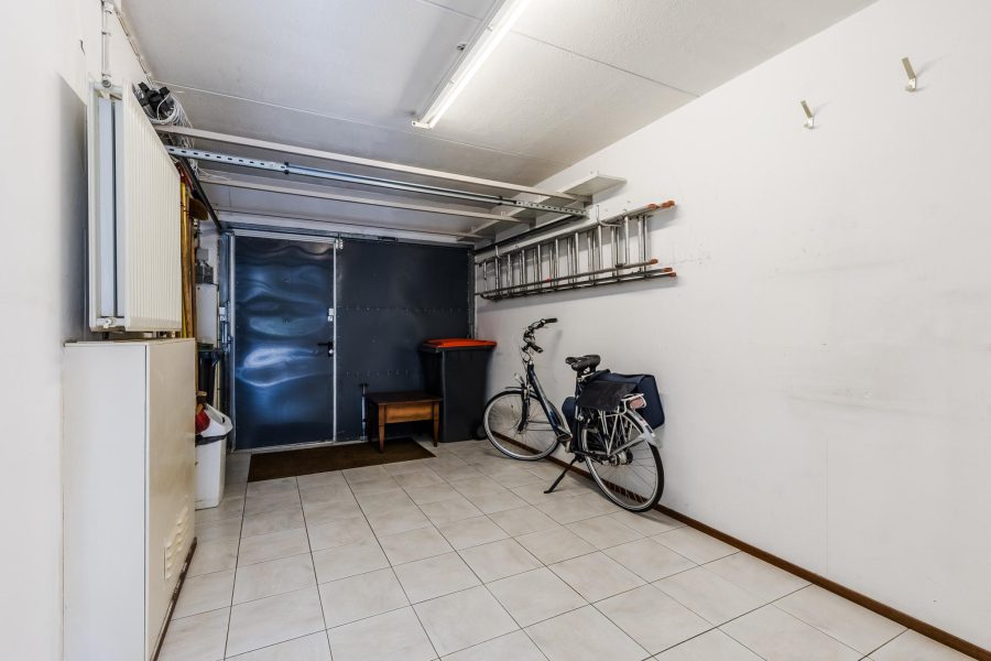 Through the partly green and partly paved front garden we reach the covered front door. Entrance with standing toilet and hand basin, meter closet, wardrobe, staircase to the first floor and access to the living room with open passage to the kitchen. The bright living room has windows at both the front and rear. At the front you have an unobstructed view. At the rear is access to the L-shaped kitchen. The kitchen has white fronts and is equipped with built-in appliances. You cook on induction here. The kitchen is large enough to fit a breakfast table. The kitchen has a high window and a door to the garden and an entrance door to the pantry. In the scullery, you will find the connection for washer and dryer. Through the scullery, the indoor garage is accessible and you can go outside through the garage. On the ground floor, there are light tiles with underfloor heating underneath and the walls and ceilings have a sleek and neutral finish.