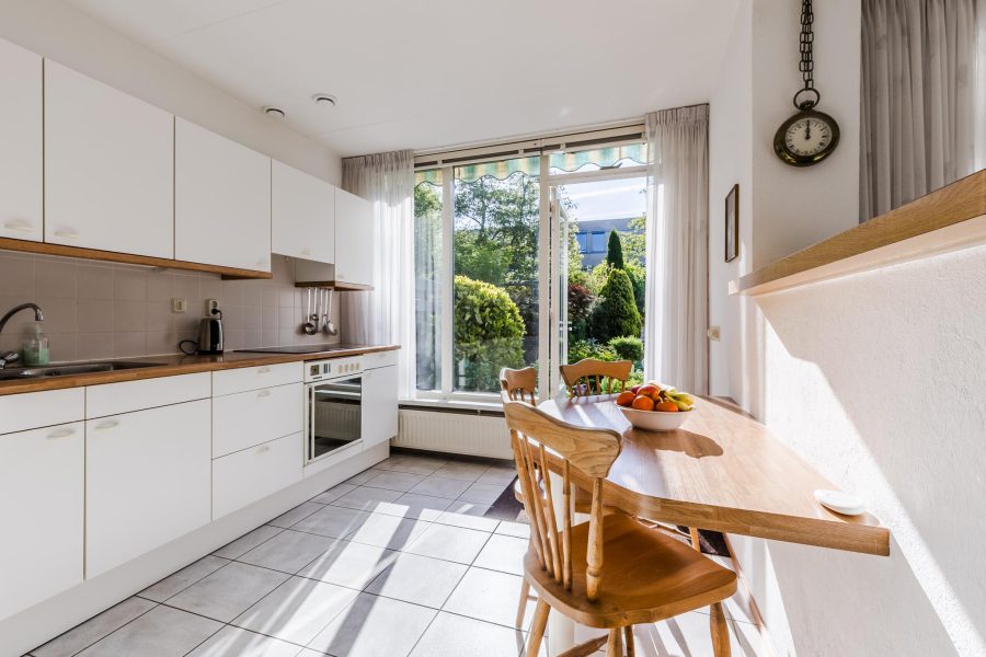 Via de deels groene en deels bestrate voortuin bereiken we de overkapte voordeur. Entree met staand toilet en fonteintje, meterkast, garderobe, trapopgang naar de eerste verdieping en toegang tot de woonkamer met open doorgang naar de keuken. De lichte woonkamer heeft zowel aan de voor- als achterzijde raampartijen. Aan de voorzijde heb je een vrij uitzicht. Aan de achterzijde is de toegang tot de L-vormige keuken. De keuken heeft witte fronten en is voorzien van inbouwapparatuur. Je kookt hier op inductie. De keuken is groot genoeg voor het plaatsen van een ontbijttafel. De keuken heeft een hoge raampartij en een deur naar de tuin en een toegangsdeur tot de bijkeuken. In de bijkeuken tref je de aansluiting voor het witgoed aan. Via de bijkeuken is de inpandige garage bereikbaar en via de garage kun je naar buiten. Op de begane grond liggen lichte tegels met eronder vloerverwarming en de muren en plafonds zijn strak en neutraal afgewerkt.