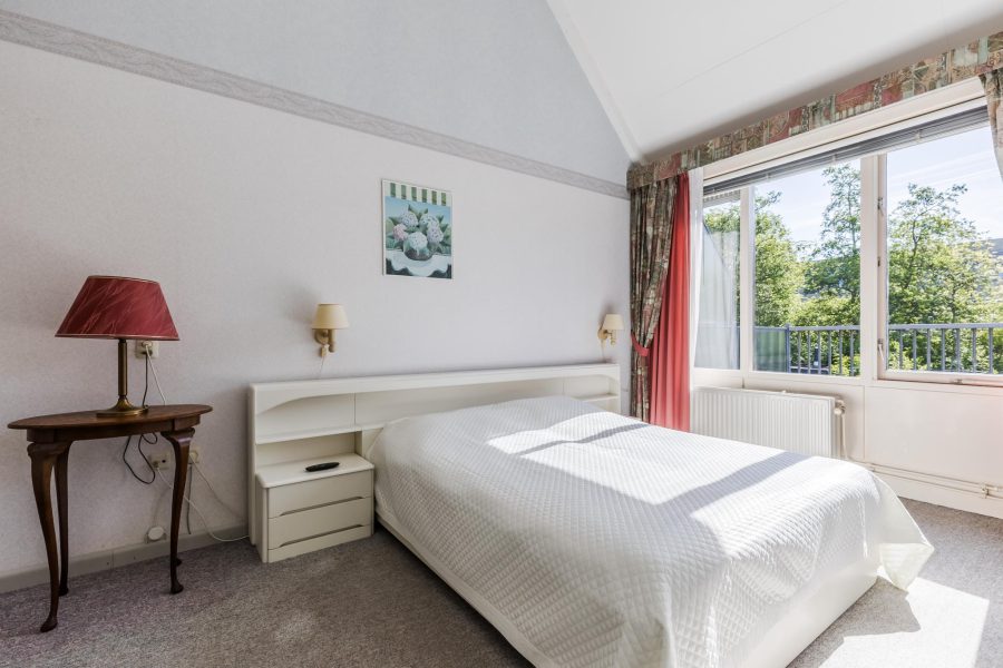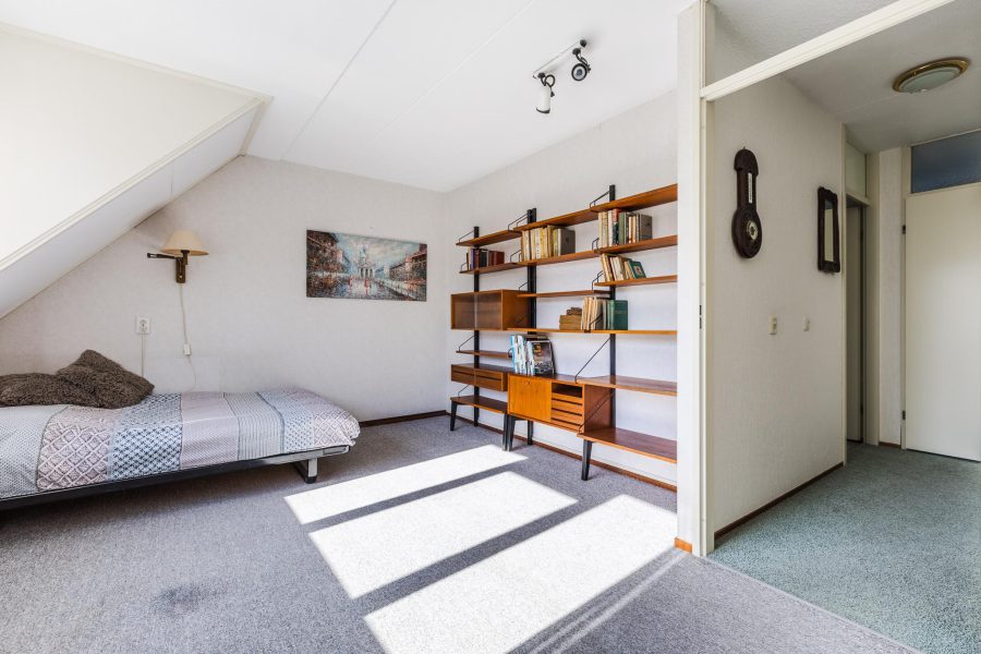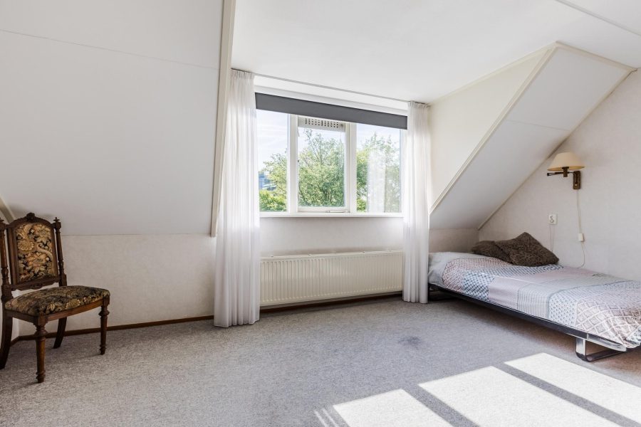 Via de gestoffeerde trap bereiken we de overloop van deze verdieping. Deze verdieping beschikt aan de achterzijde over een dakkapel en biedt de mogelijkheid om een ruim dakterras te realiseren. Je treft hier drie royale slaapkamers en de badkamer aan. Twee slaapkamers liggen aan de achterzijde, eentje loopt door naar de voorzijde en de derde ligt aan de voorzijde, naast de badkamer. Op deze verdieping ligt tapijt op de vloer. In de badkamer tref je een wastafel met spiegel, een ligbad en een inloopdouche aan.