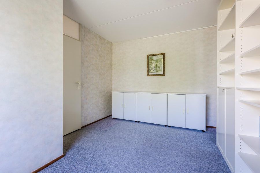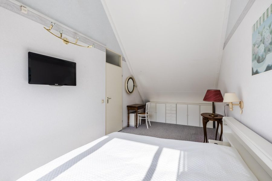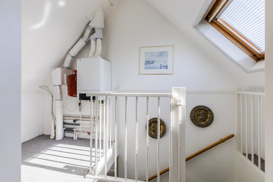 Via the upholstered open staircase we reach bedroom number four. Here you will also find storage space. The landing houses the technical installation. Daylight enters here via Velux skylights. This floor is also nicely finished.