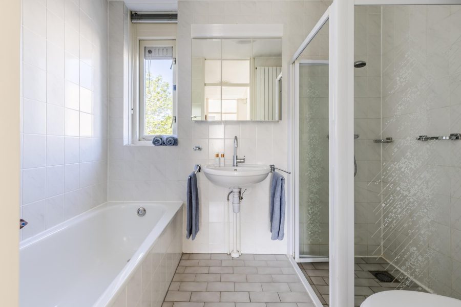 Via the upholstered staircase, we reach the landing of this floor. This floor features a dormer at the rear and offers the possibility to create a spacious rooftop terrace. You will find three spacious bedrooms and the bathroom here. Two bedrooms are at the back, one runs through to the front and the third is at the front, next to the bathroom. This floor is carpeted. In the bathroom, you will find a washbasin with mirror, a bathtub and a walk-in shower.