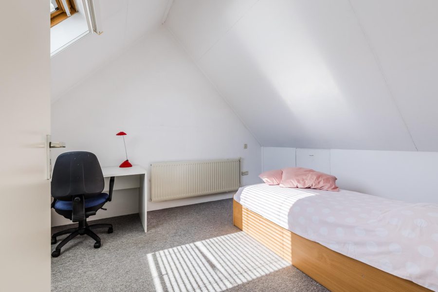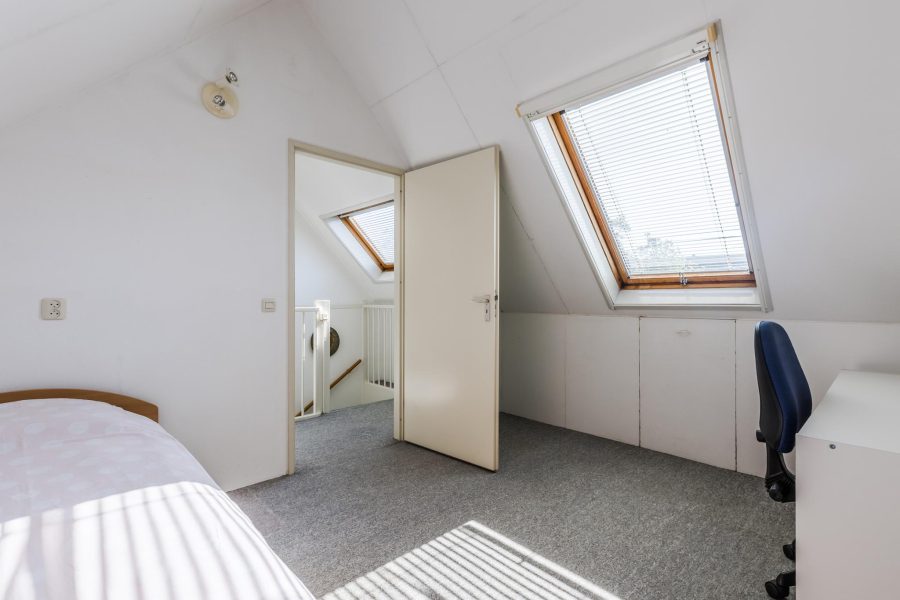 Via de gestoffeerde open trap bereiken we slaapkamer nummer vier. Ook tref je hier nog bergruimte aan. Op de overloop is plaats voor de technische installatie. Het daglicht komt hier via Velux dakramen binnen. Ook deze verdieping is keurig afgewerkt.