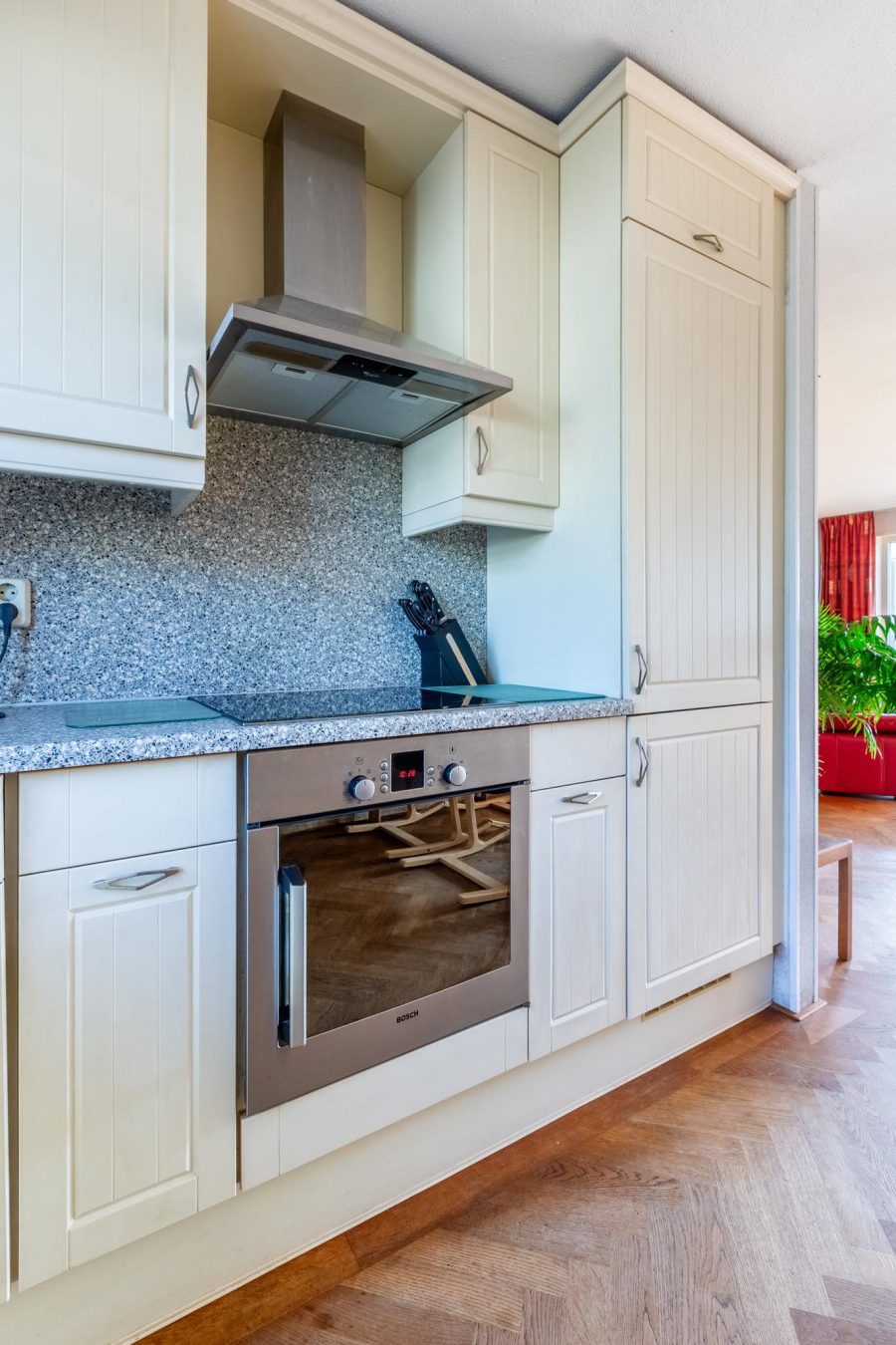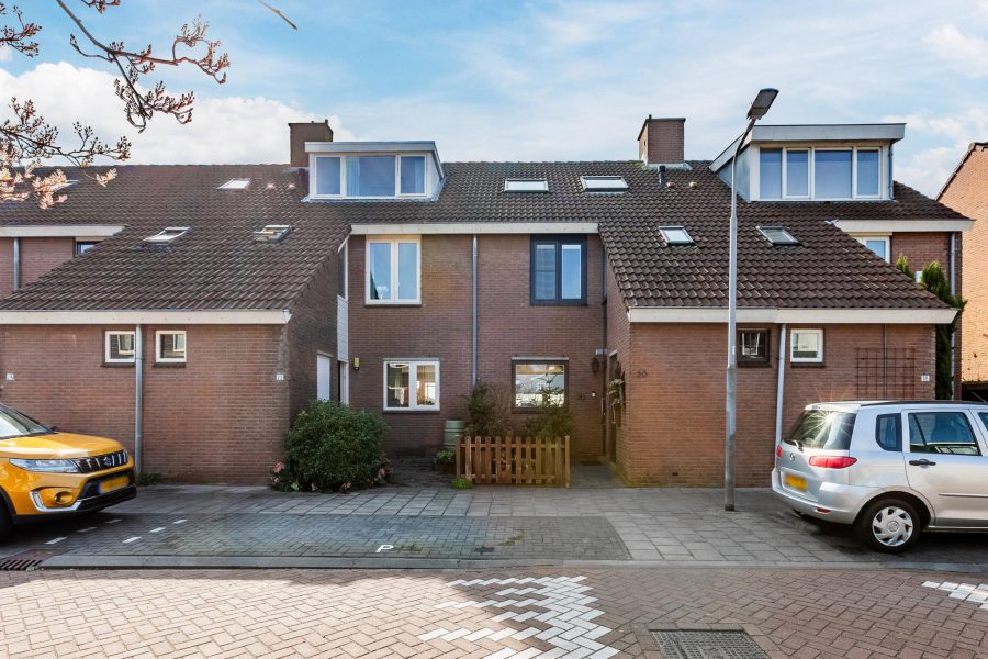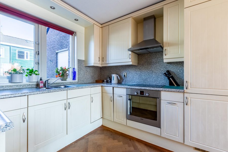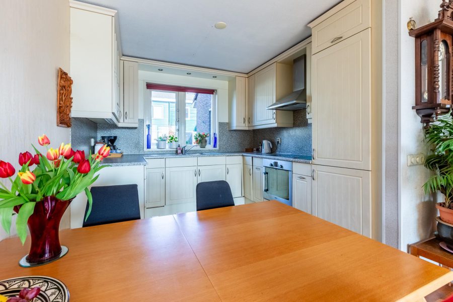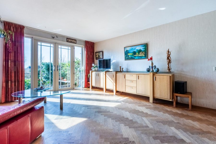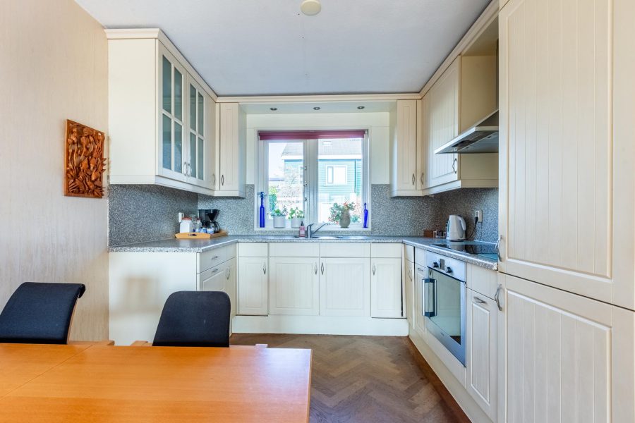 Via de deels groene, deels betegelde voortuin bereiken we de voordeur van de woning. Entree met garderobe en meterkast, staand toilet met fonteintje, trapopgang naar de eerste verdieping en toegang tot de woonkamer met open keuken. De lichte tuingerichte woonkamer heeft aan de achterzijde een brede, hoge raampartij met openslaande deuren naar de tuin. Aan de voorzijde is de U-vormige keuken gesitueerd. De keuken heeft witte fronten en is voorzien van diverse inbouwapparatuur. Je kookt hier elektrisch. De koel/vriescombinatie is in 2020 vervangen. Op de vloer van de kamer ligt parket in visgraatverband. In de gang liggen tegels op de vloer. De muren en plafonds zijn strak afgewerkt. In de kamer bevindt zich een trapkast.